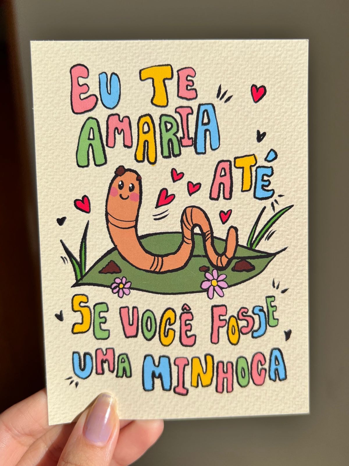 O cartão Minhoca é sobre amar as pessoas do jeitinho que elas são. Uma forma de dizer que você gosta mesmo é da essência dessa pessoa especial. Não importa se ela esteja no próprio corpo ou se torne uma minhoca! Amor de verdade é assim, algumas coisas mudam mas ele permanece firme e forte.