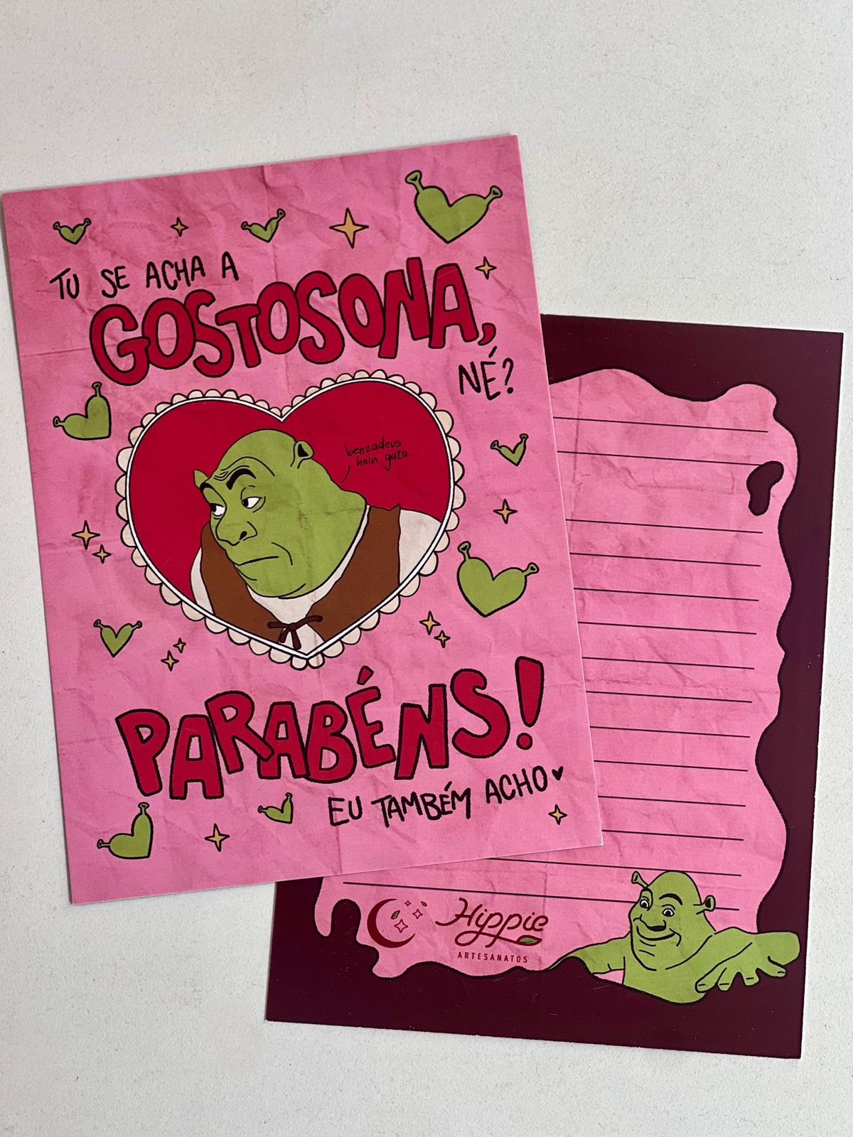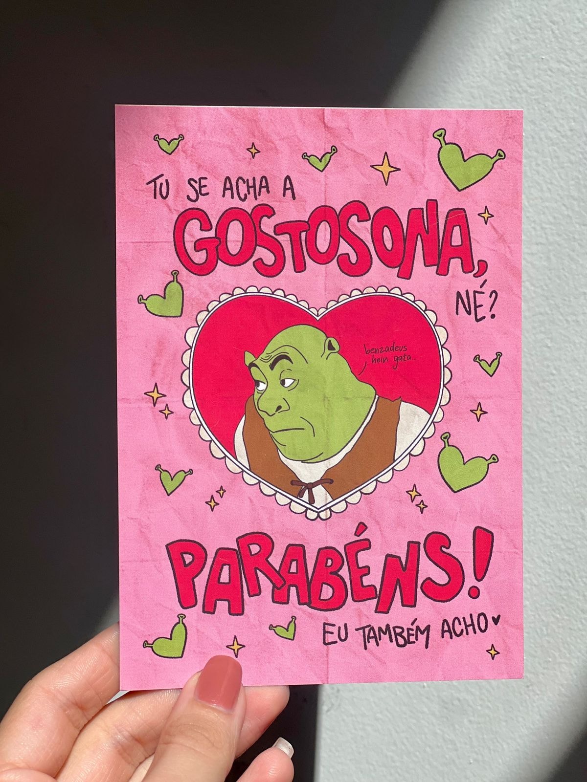 Tu se acha a gostosona, né? Parabéns! Eu também acho <3 Esse cartão é como um Troféu de Gostosa. Quem receber o cartão Sherek Gostosona de presente vai ter um lembrete eterno da própria gostosura (além de se lembrar da pessoa que presenteou a cada vez que olhar para o cartão). Uma forma de demonstrar seu amor e nutrir a autoestima da pessoa querida :)