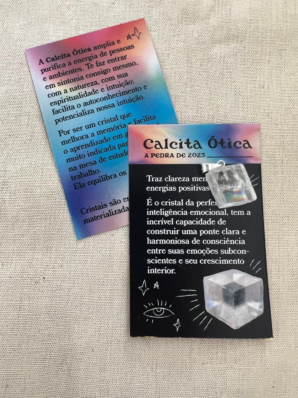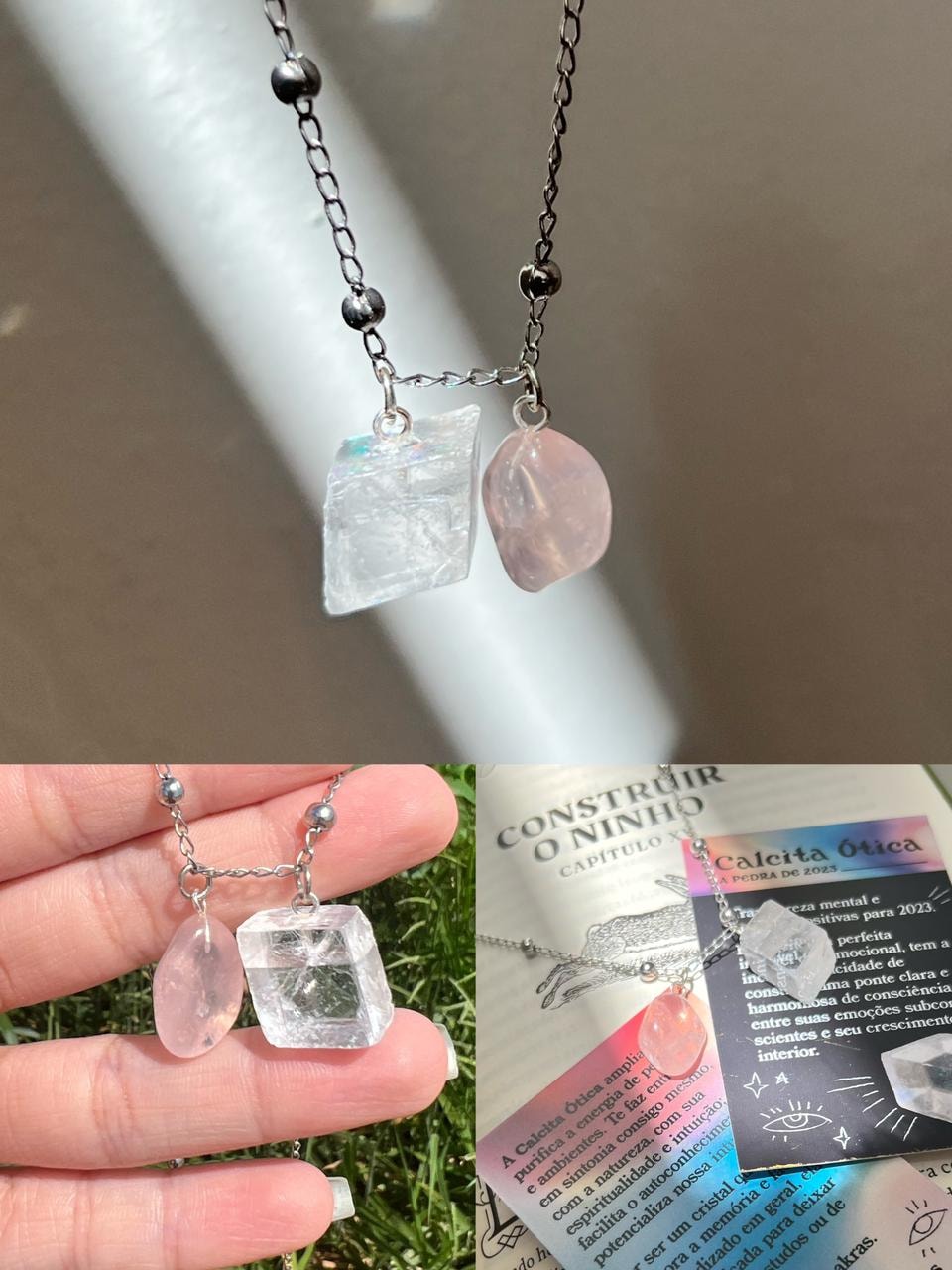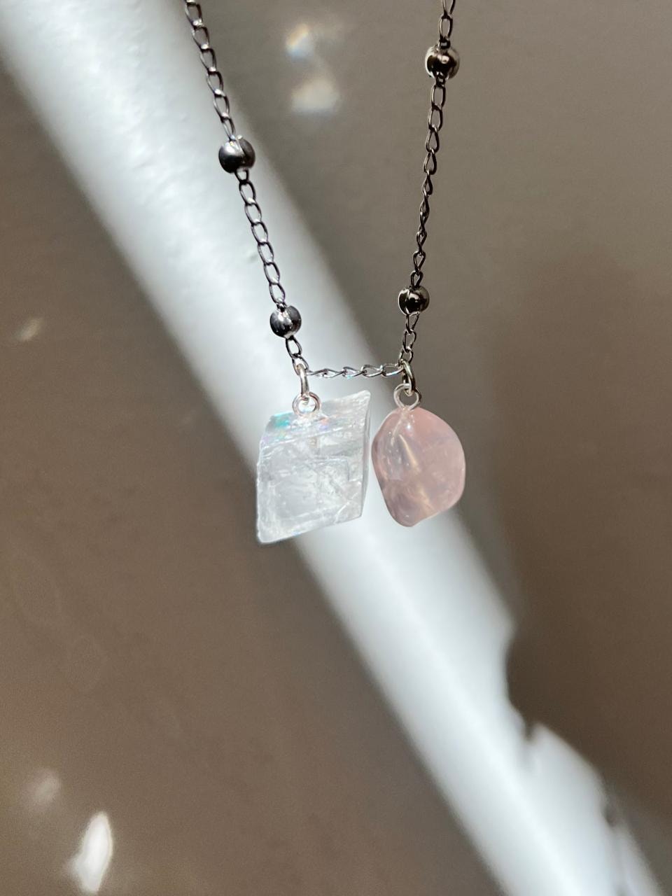 Colar artesanal com Calcita Ótica e Quartzo Rosa.