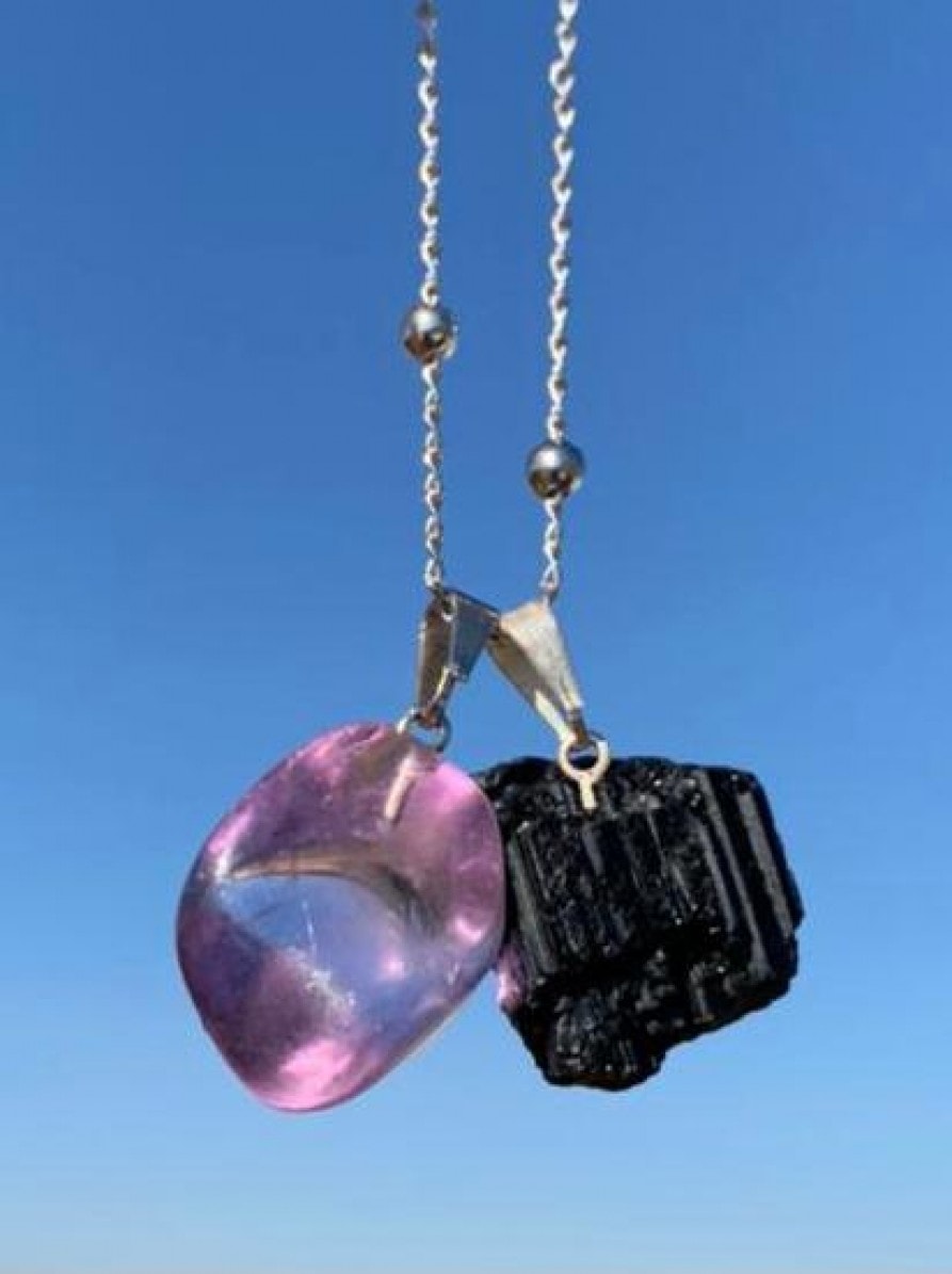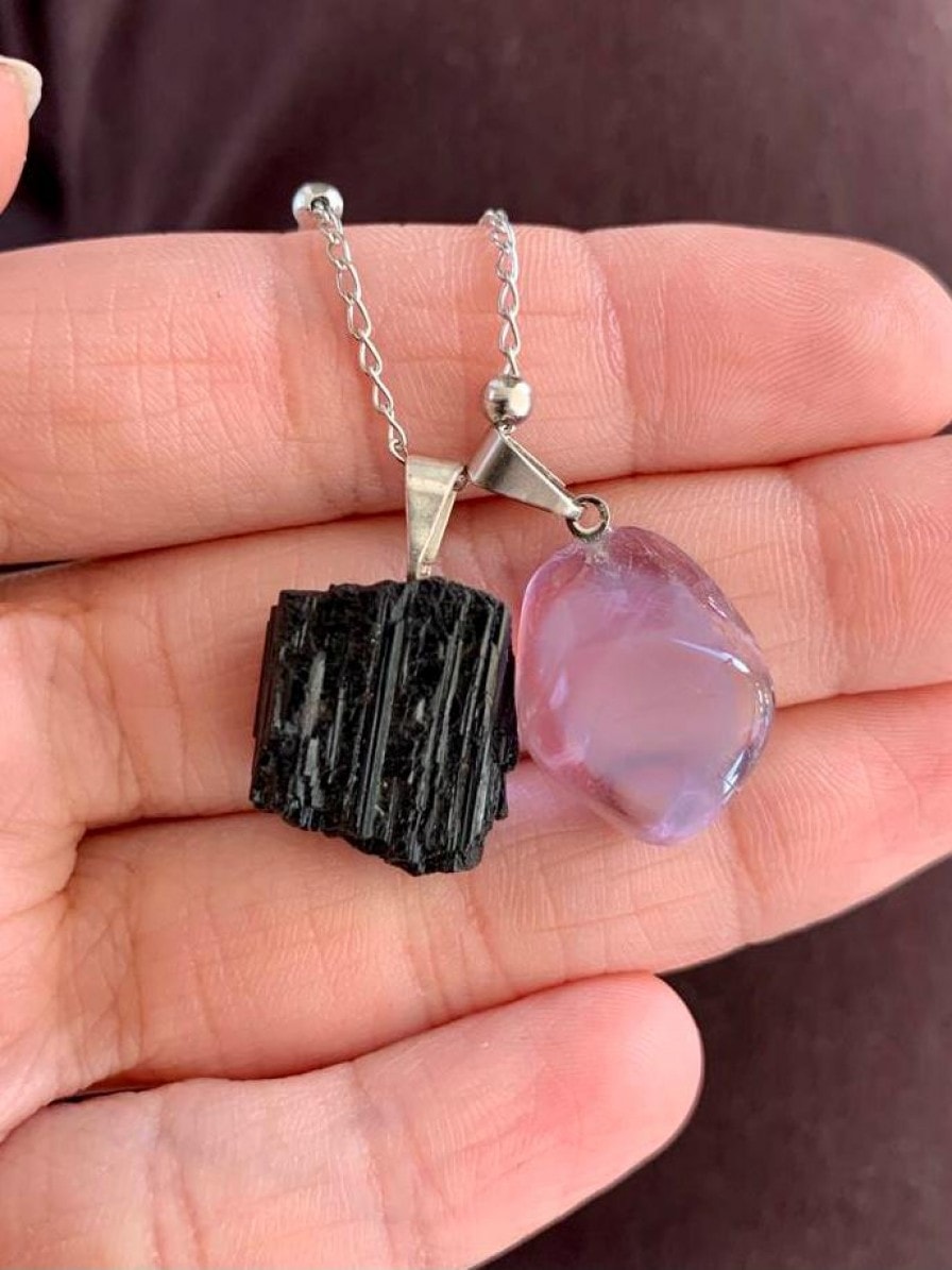 Pedras escolhidas para a composição: Turmalina: é a pedra de proteção energética e espiritual mais abrangente da natureza. Atua contra más energias e influências negativas. Ainda, é um mineral que traz grande ensinamento, nos auxiliando a manter uma profunda consciência espiritual. Ametista: é a pedra da sabedoria e equilíbrio. Está ligada à elevação espiritual. Ametista vem da palavra grega ‘amethustos’ que significa ‘não intoxicar’. Sua cor violeta melhora a captação de energia vital do ambiente.