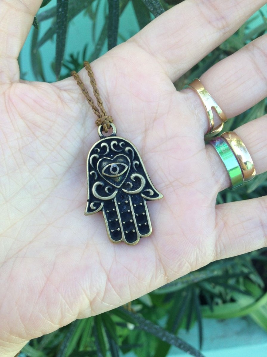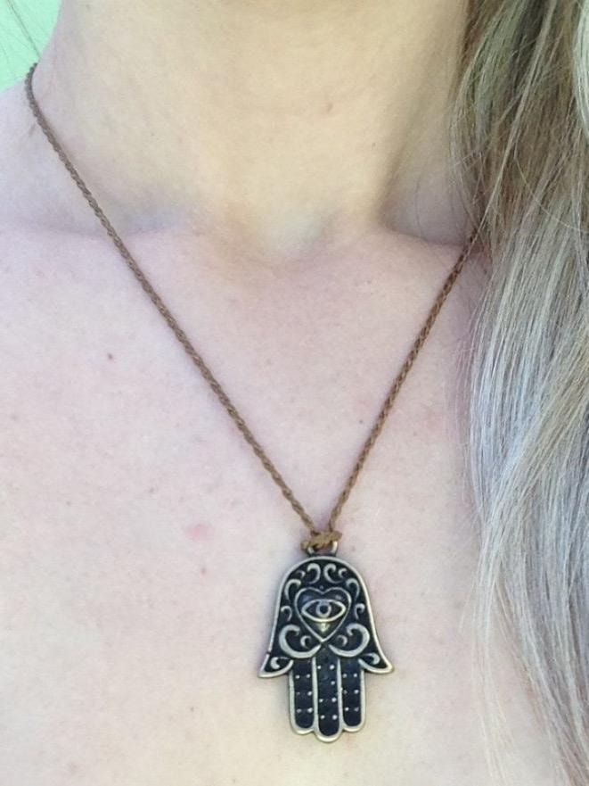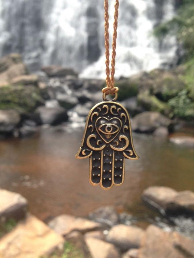 Colar artesanal com pingente Hamsá. Cordão trançado à mão.