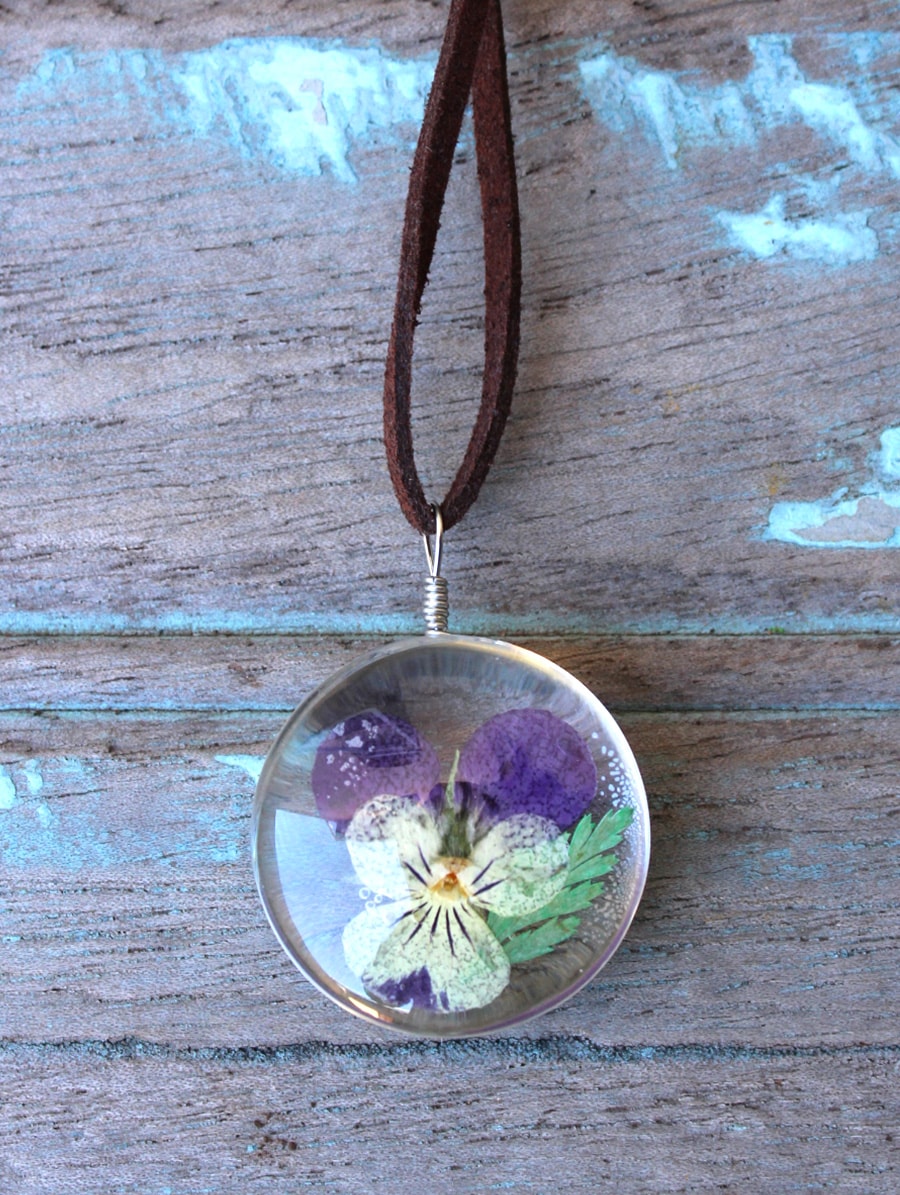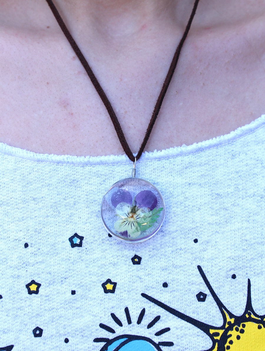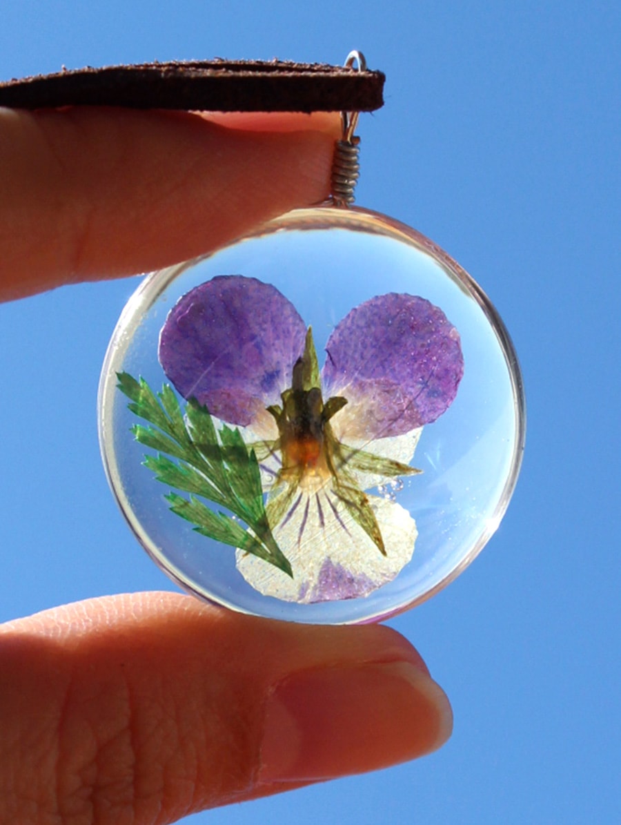 Material: Cordão de camurça, resina e orquídea natural. Medida: 45cm de comprimento. Pingente de 3cm de diâmetro.