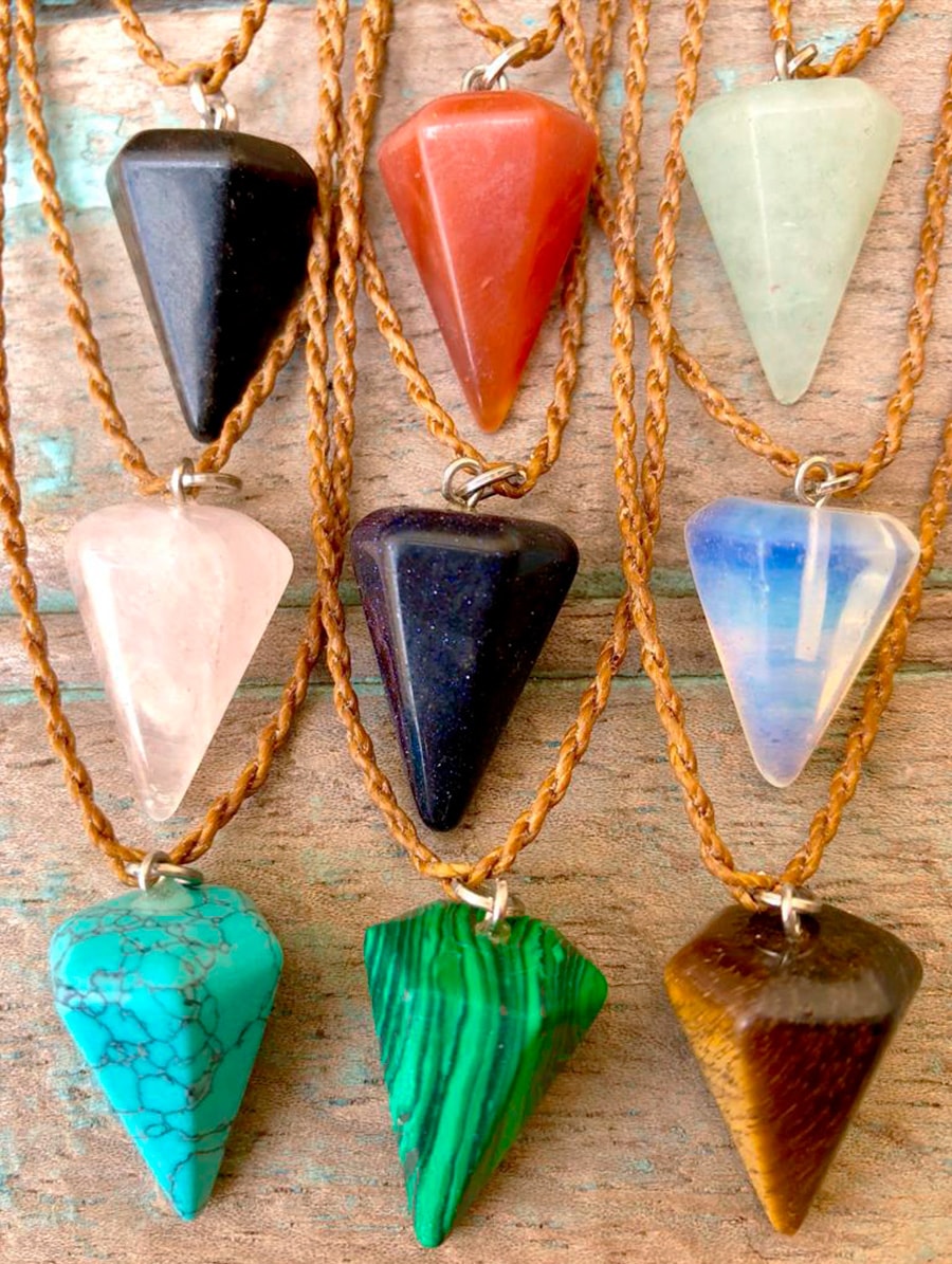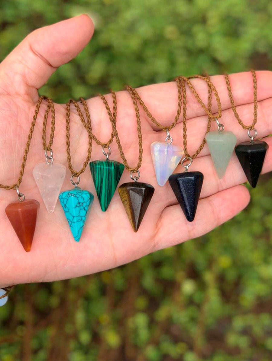 O pêndulo é um objeto místico que fica pendurado em um fio e que faz movimentos oscilatórios. Em geral, é usado para medir os campos energéticos, a radiação e a frequência. Serve como uma espécie de oráculo. Pedras e cristais são utilizados há milênios para desenvolver a intuição e a aprendizagem através dos sentidos. Dizem que é a pedra que te escolhe, que a energia do cristal irradia e ilumina no momento da seleção. É uma escolha intuitiva.