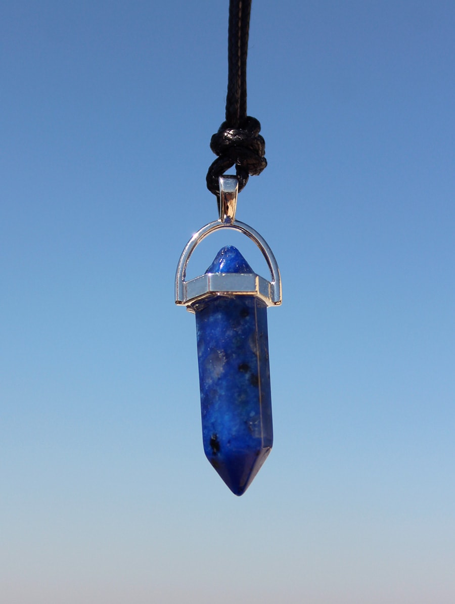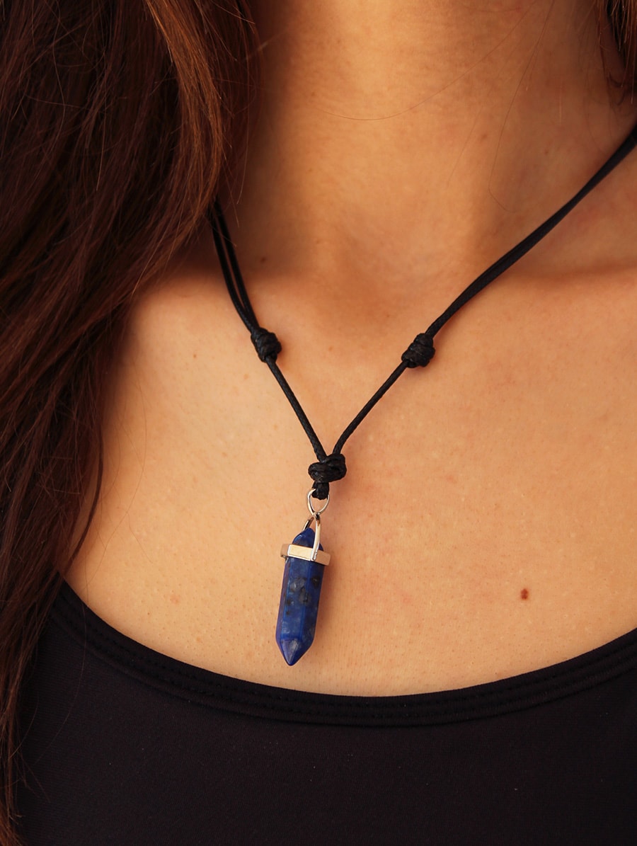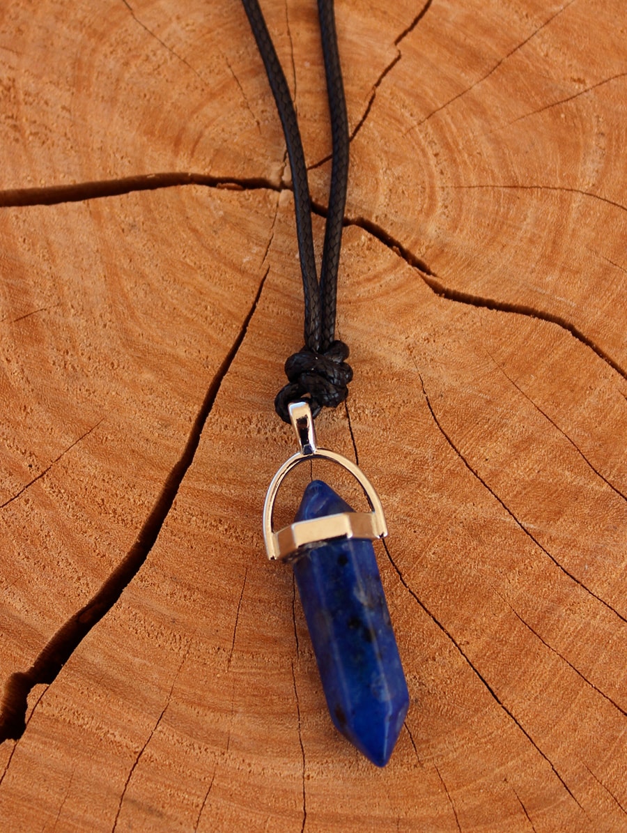 Material: Pedra natural em formato de ponta e cordão de couro sintético.