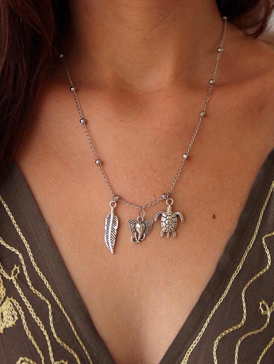 Colar artesanal com pingentes Elefante, Pena e Tartaruga.