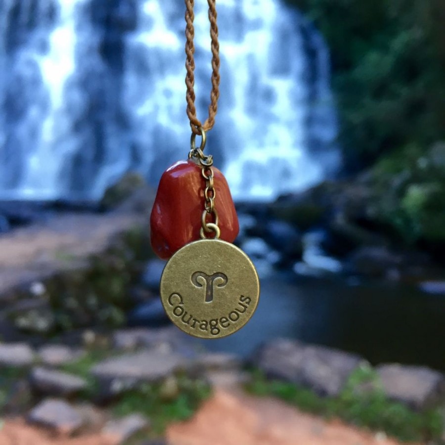 Pedra escolhida para a composição: Jaspe: é altamente combativa. Uma das pedras mais indicadas para proteção pessoal. No lado emocional, a jaspe dá sustentação para atravessar os momentos difíceis.