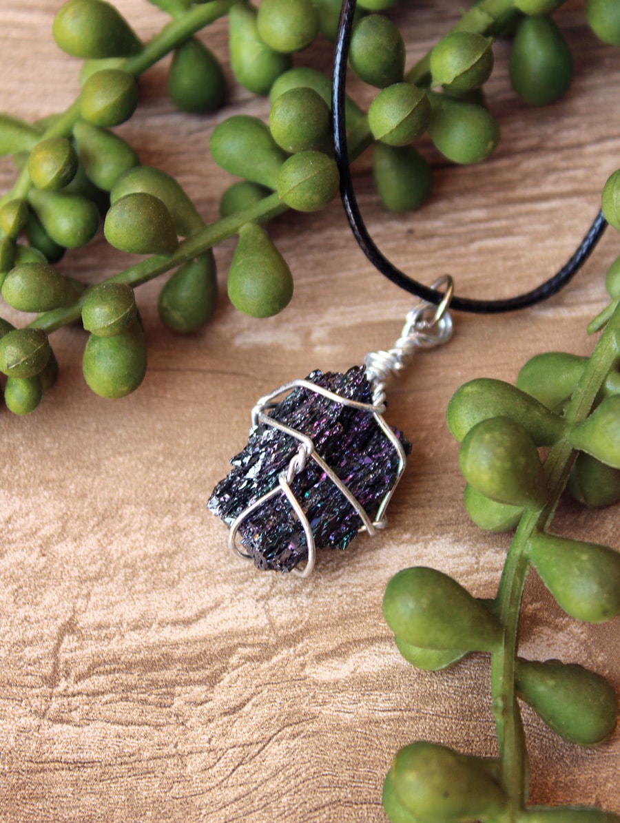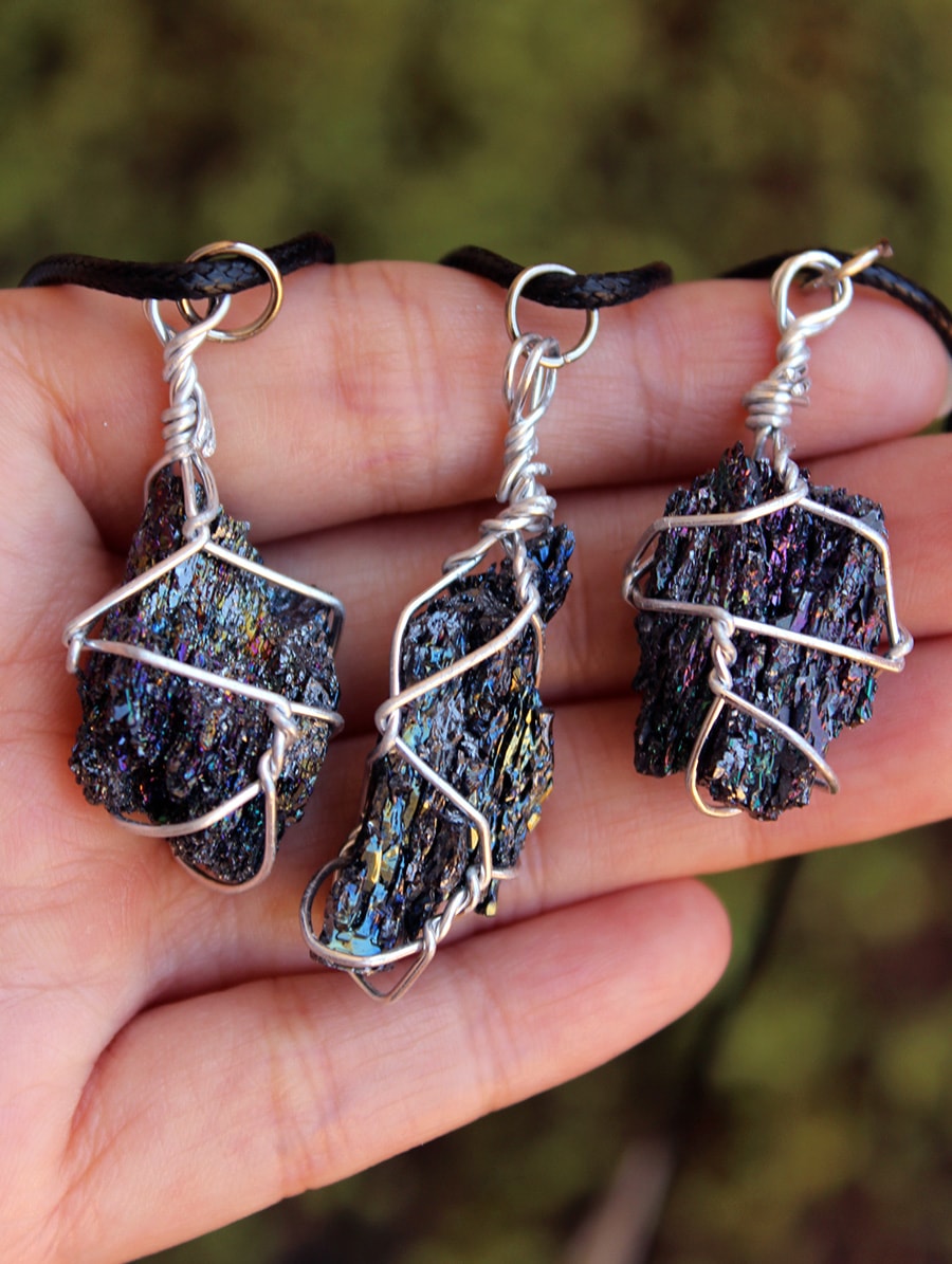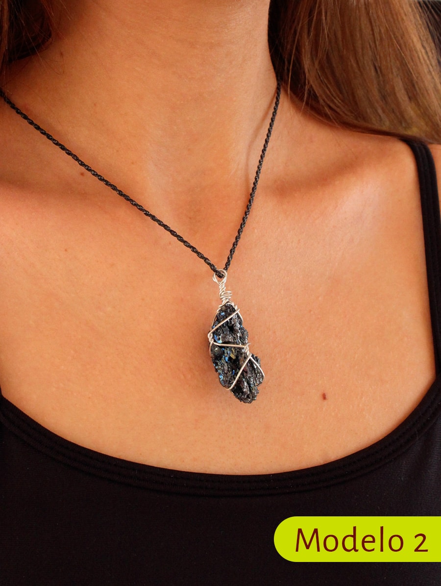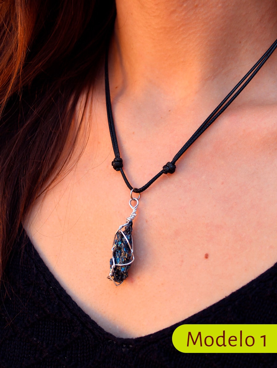 Modelo 1: cordão preto de couro sintético (sem origem animal). Regulável. Modelo 2: cordão preto encerado artesanal. Com 60cm de comprimento.
