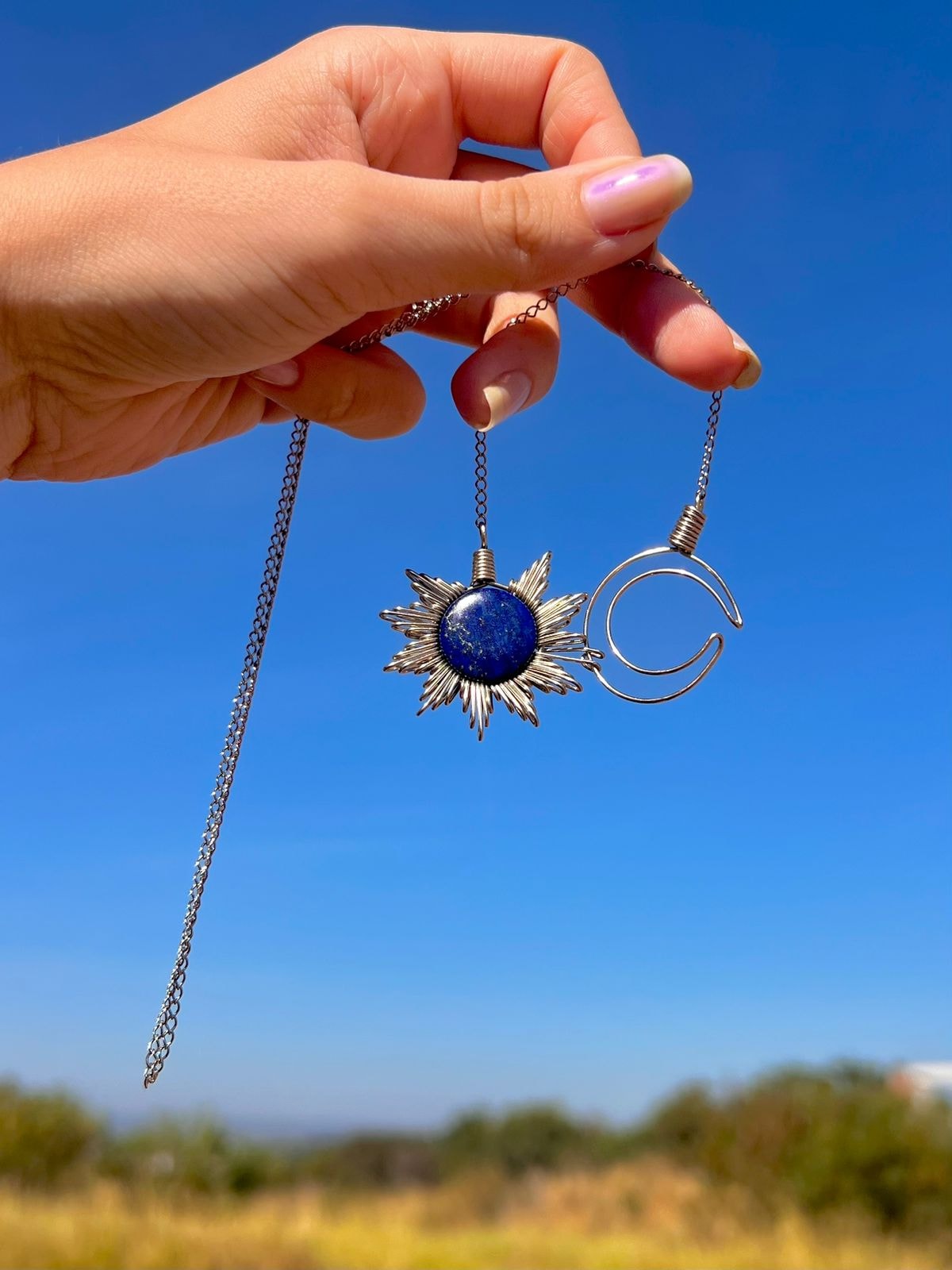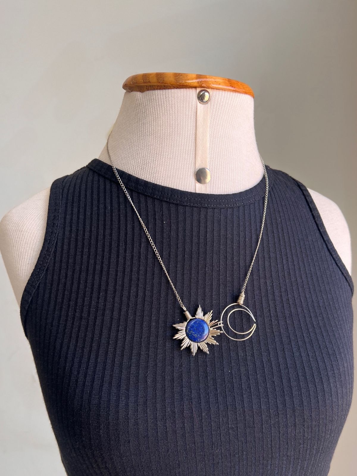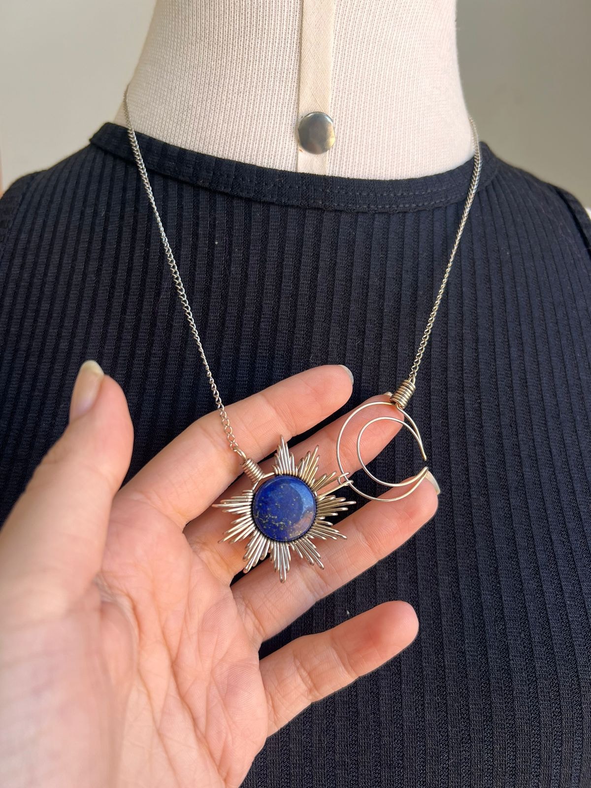 Colar artesanal com pingente Sol e Lua feito à mão.