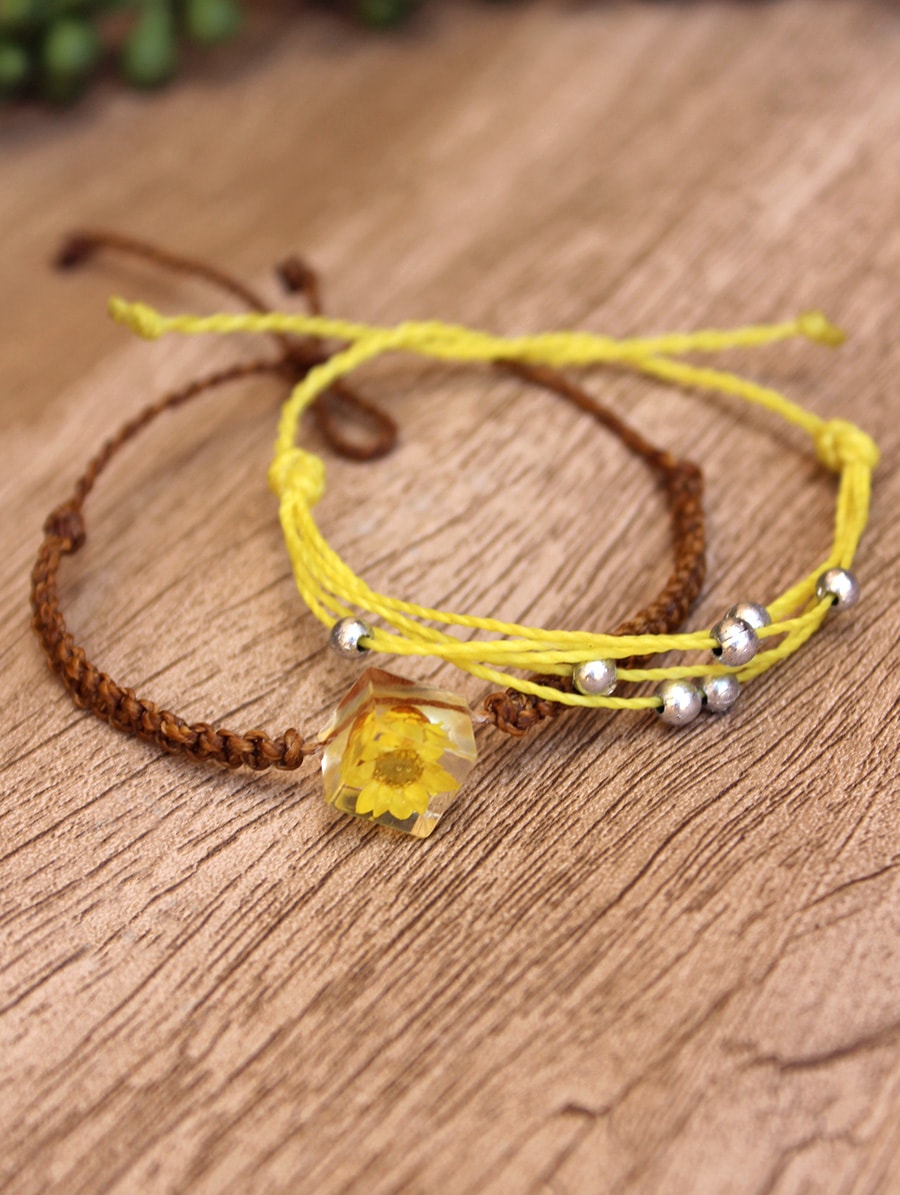 Material: Cordão encerado, pingente de resina com flor natural desidratada e miçangas prateadas. Medida: Regulável. De amarração.