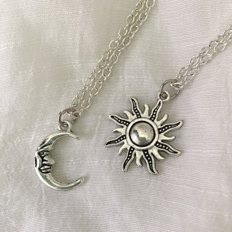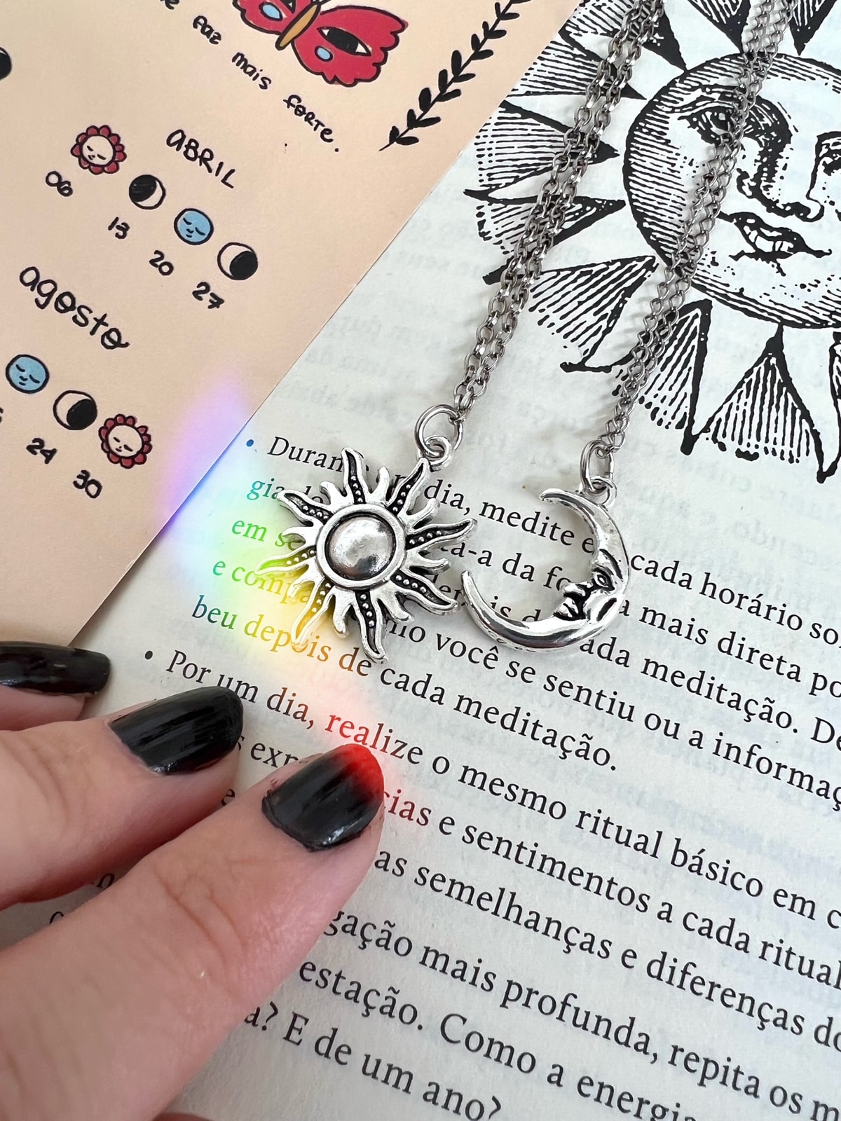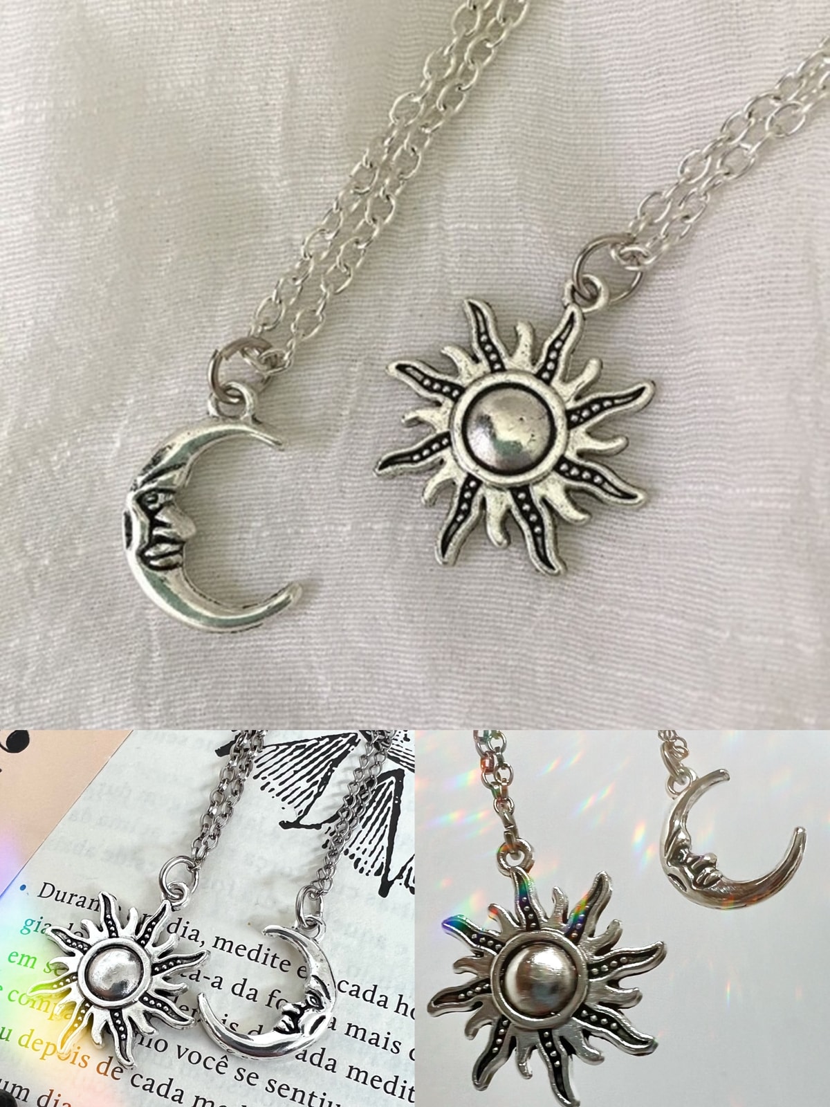 Conjunto de colares artesanais com pingentes Sol e Lua.