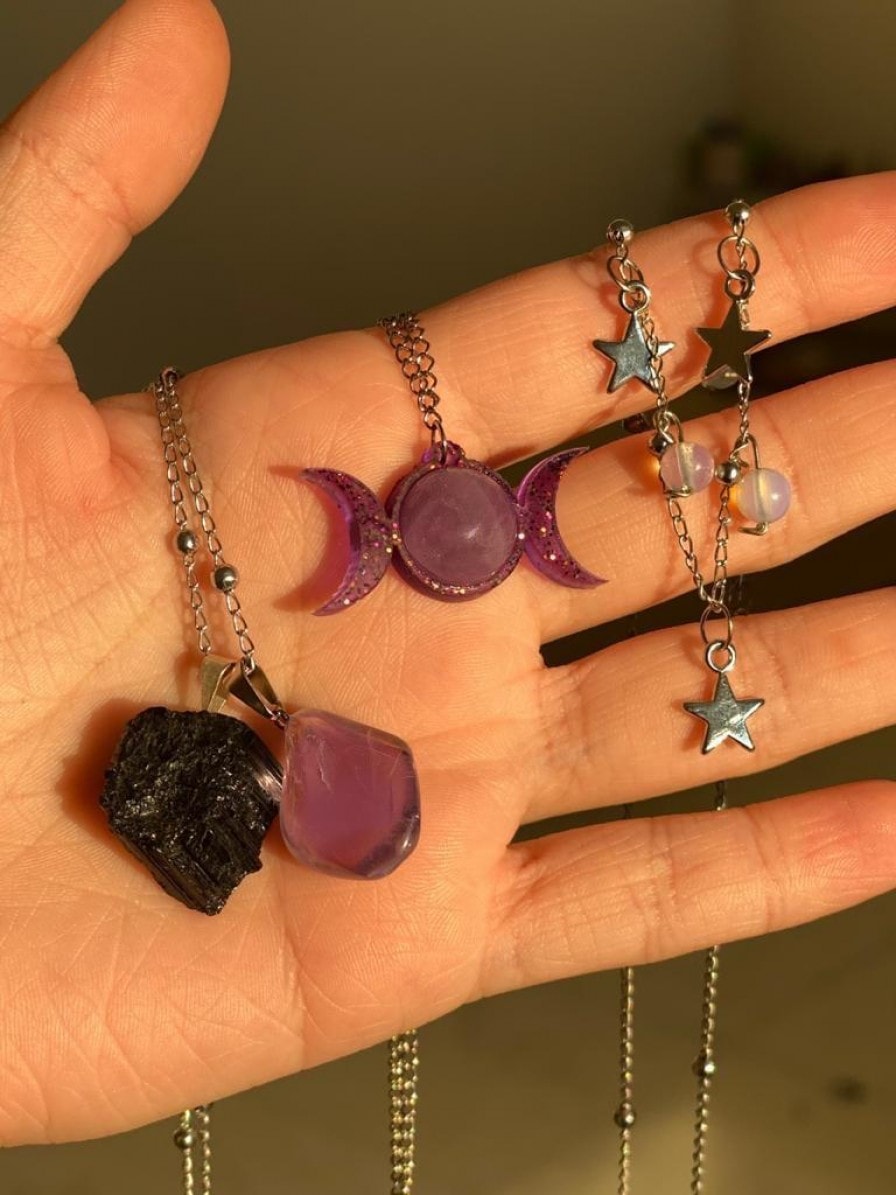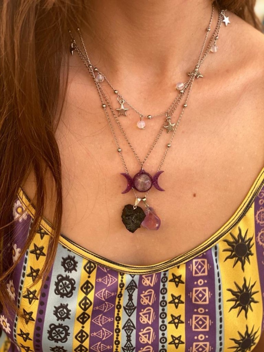 Esse conjunto de colares reúne pedras, que são elementos naturais, a simbologia Wicca da triluna e a representação de estrelas, astros que atuam como guias. A união destes atributos nutre as bruxas modernas de força e poder. A cor roxa, presente nos colares, é a cor que mais representa o misticismo e a feitiçaria. Por isso, também fala sobre sabedoria e intuição.