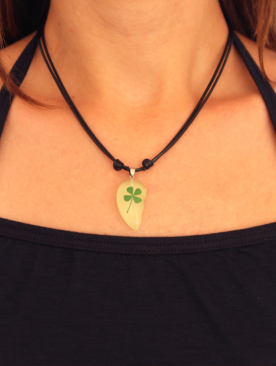 Material: Resina com trevo de quatro folhas natural e cordão de couro sintético (sem origem animal).