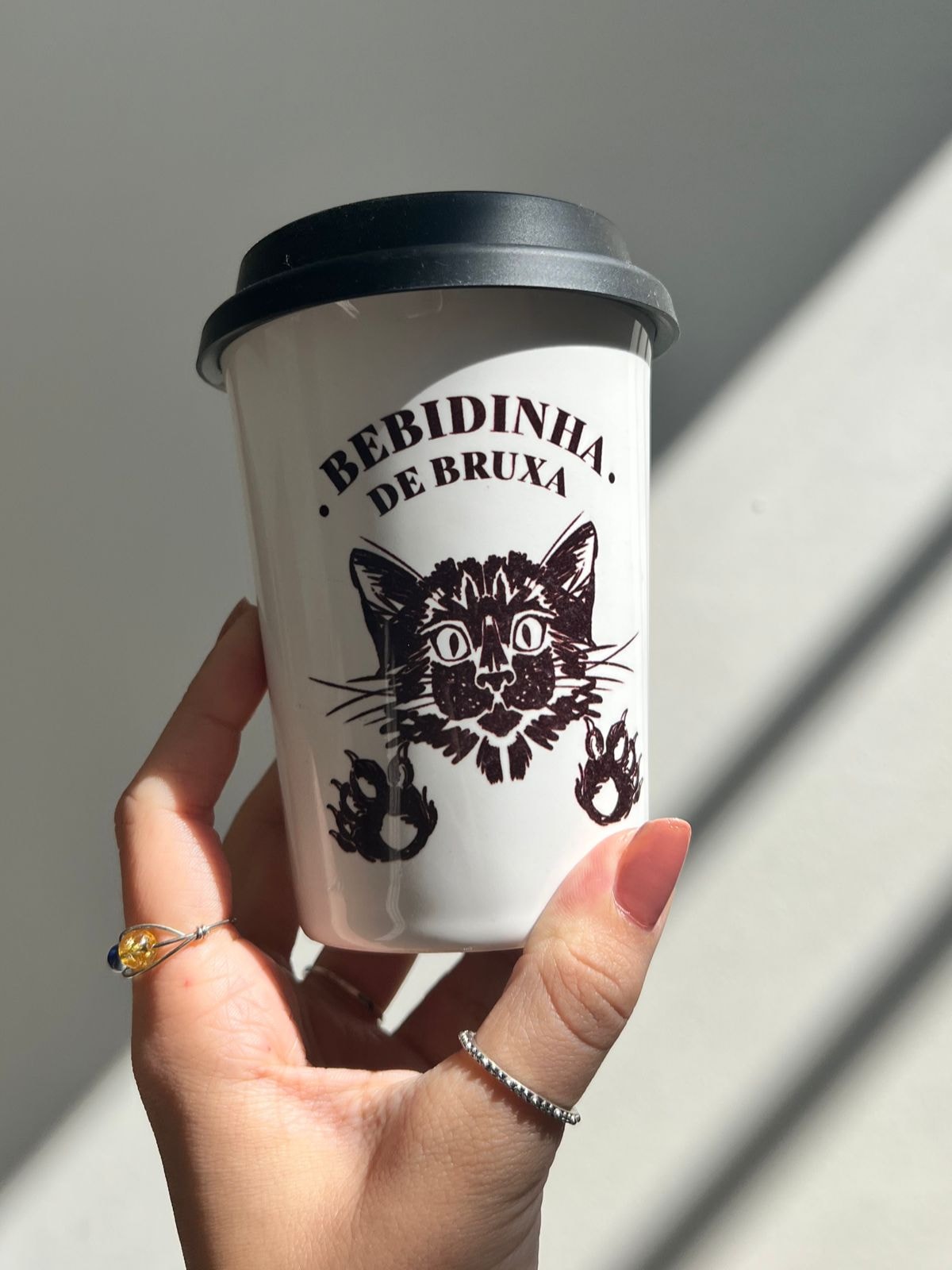 Na Idade Média acreditava-se que gatos pretos eram bruxas disfarçadas. Por isso, o Copo Café Bebidinha de Bruxa é estampado com um felino misterioso e mágico.