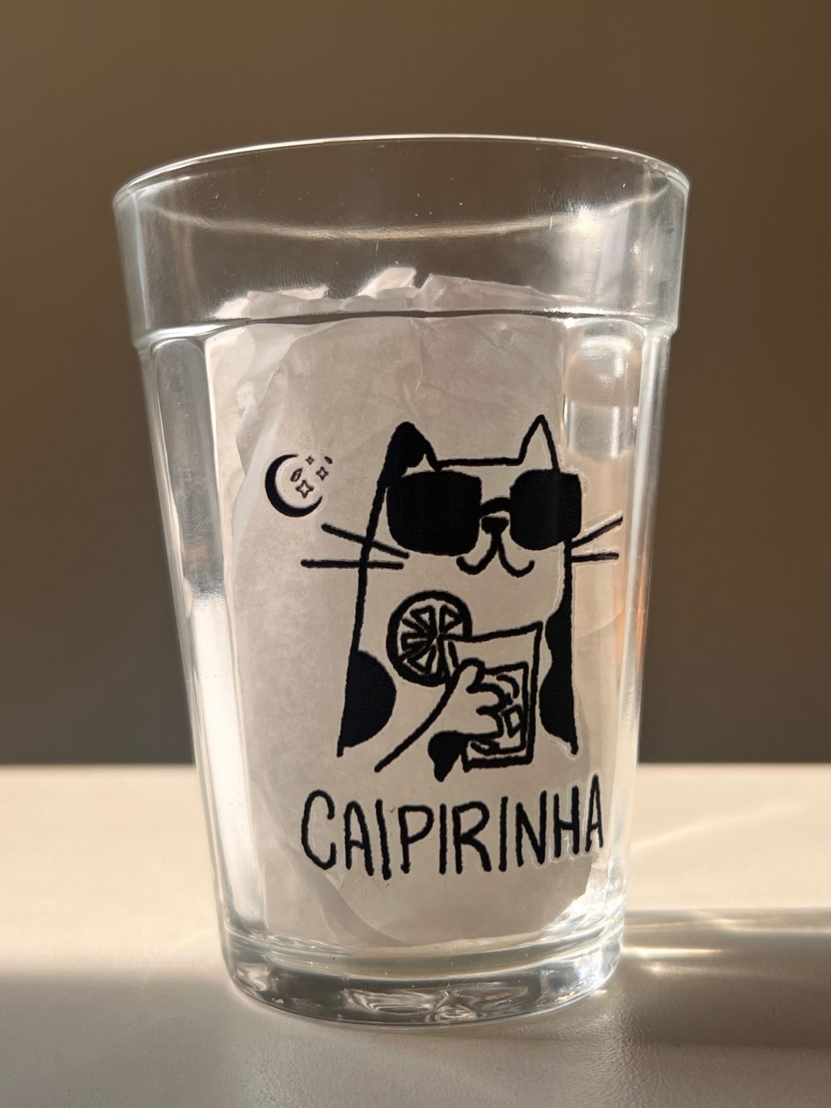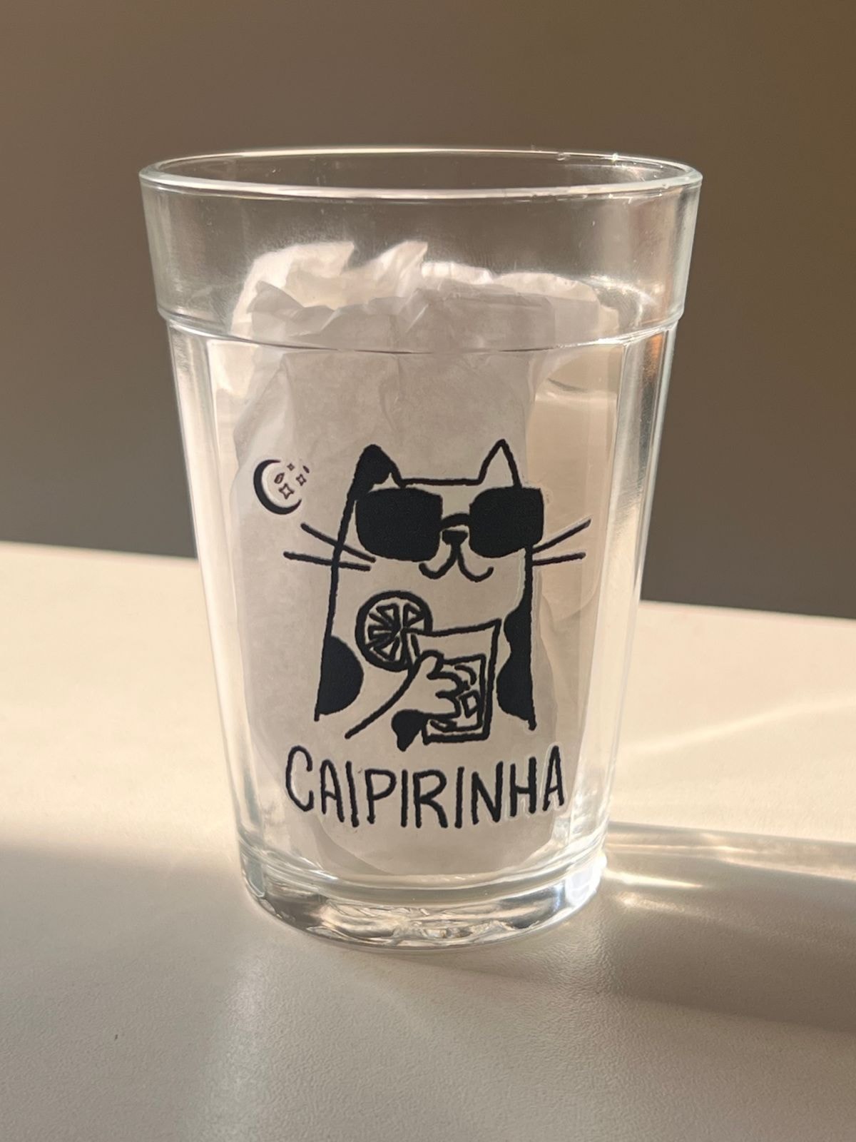 O copo Gato Caipirinha traz nosso animal preferido ilustrando uma parte do verso que mais representa a energia brasileira: Pé na areia, caipirinha, água de coco, cervejinha.