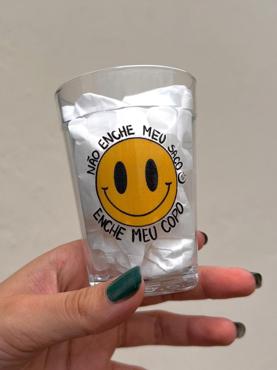 O copo Smiley traz uma mensagem direta: Não enche meu saco, enche meu copo. Para você não ter que falar, a gente desenha :)
