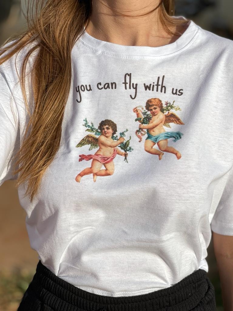 O convite que os anjos fazem nessa camiseta, "Você pode voar com a gente", é sobre percorrer esses diferentes universos, fazer viagens astrais e ser protegido pelos anjos.