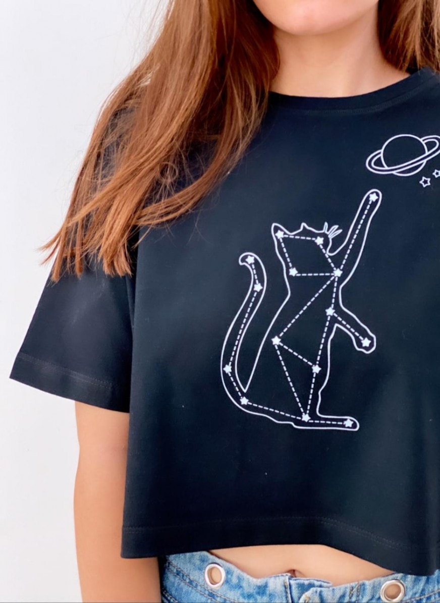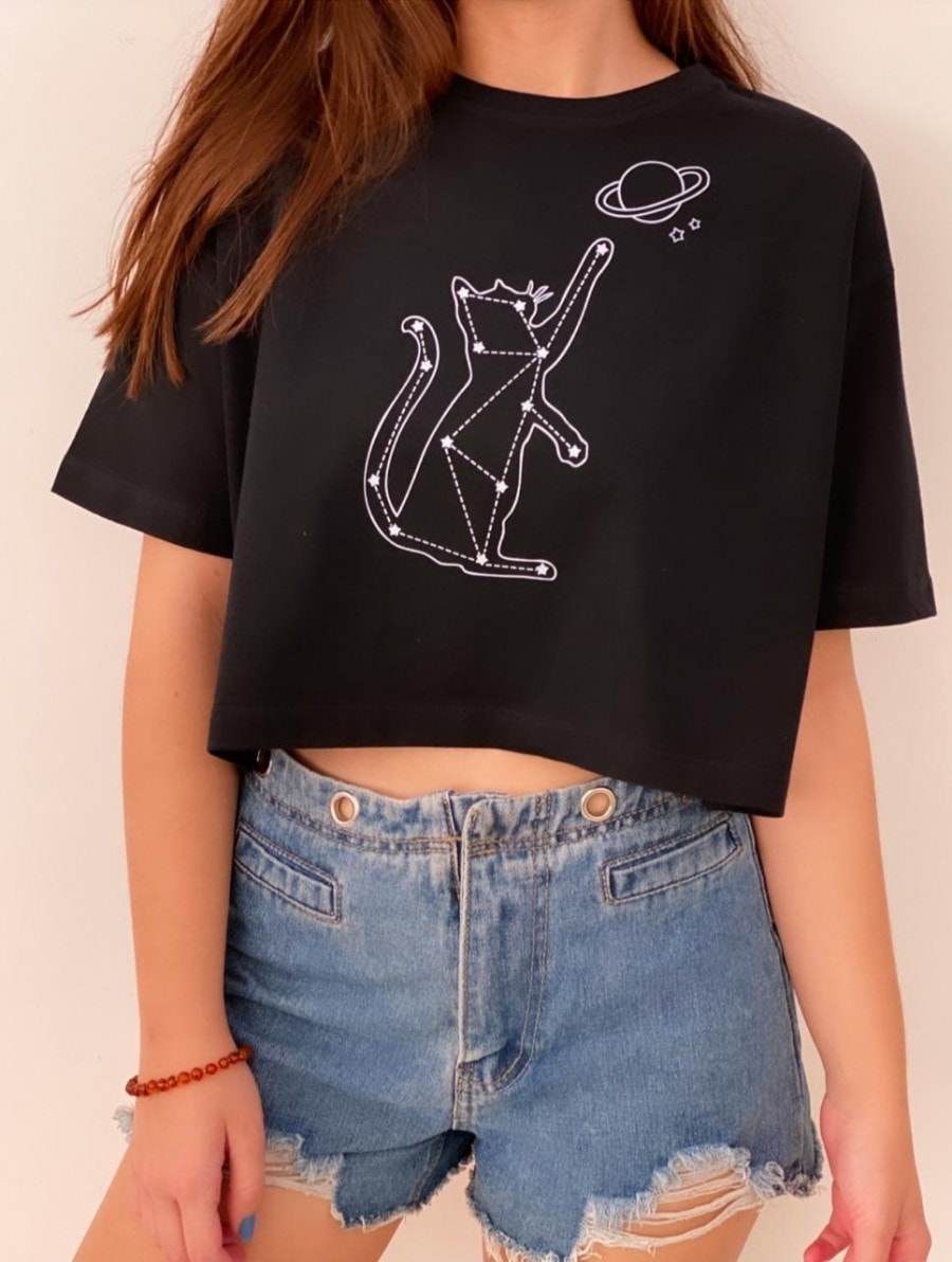 O cropped Gato Constelação representa o felino através das linhas do cosmo.