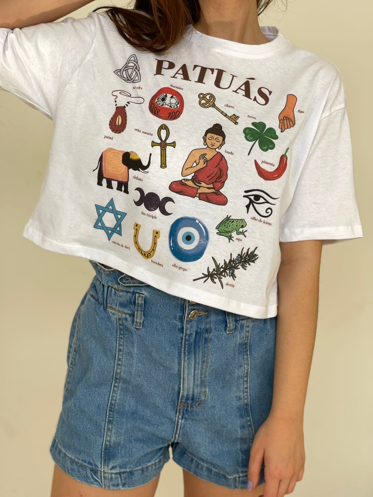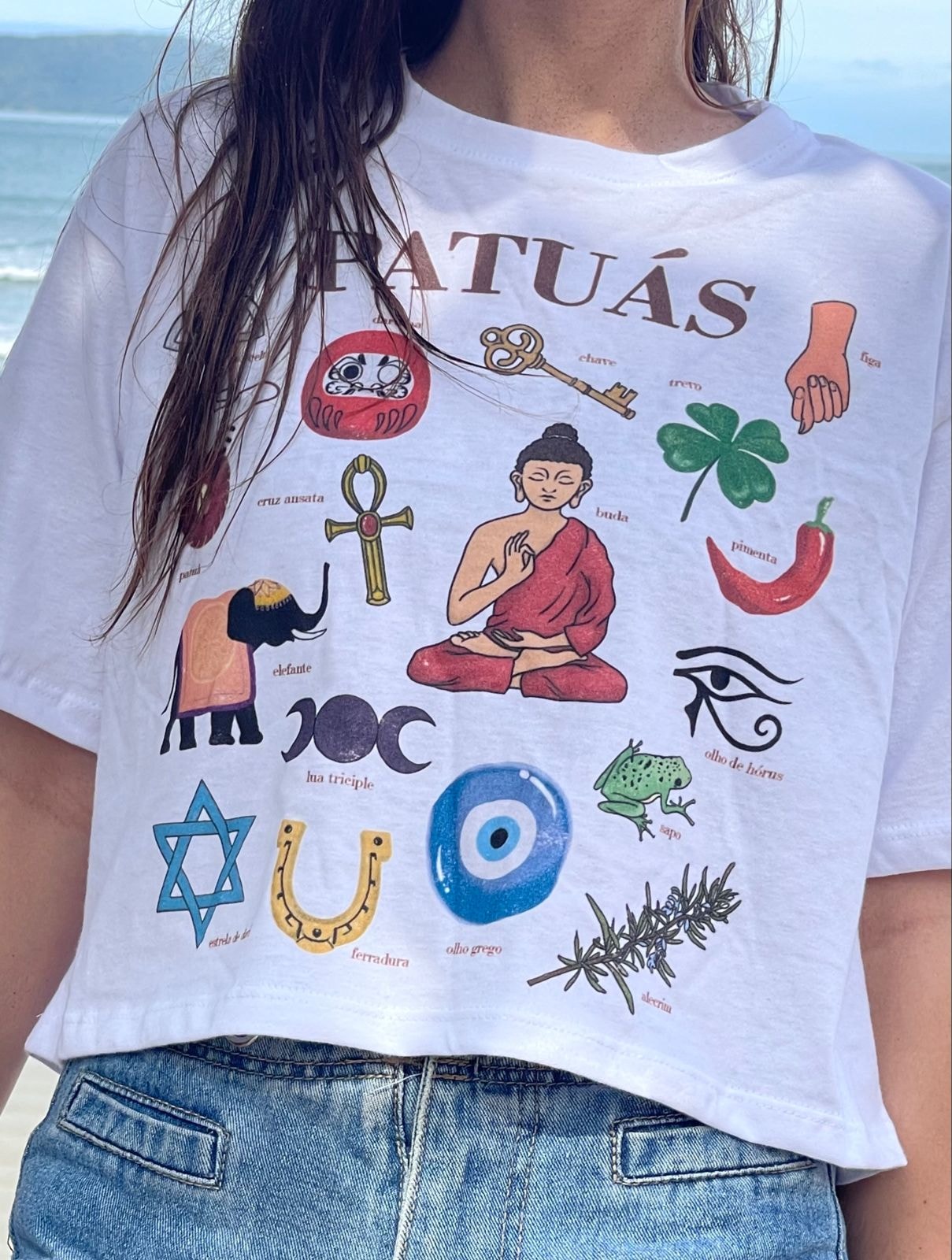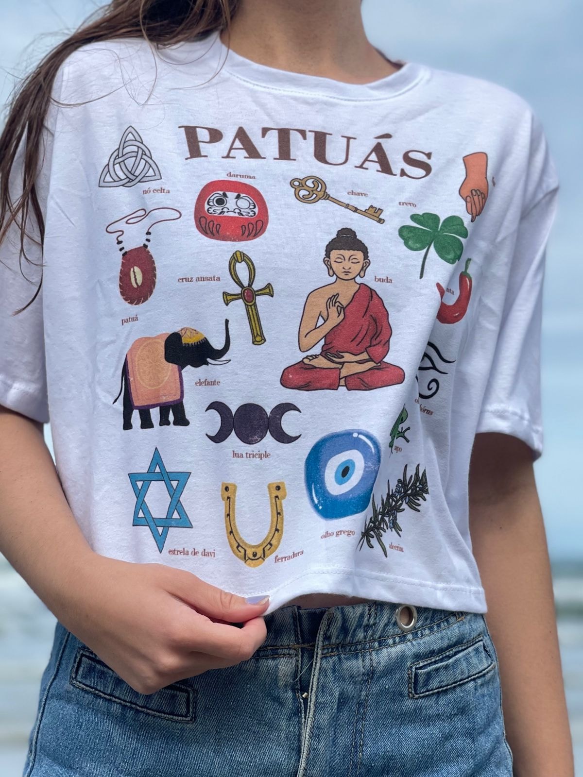 O cropped Patuás traz a representação de símbolos e objetos considerados talismãs protetores em diferentes culturas.