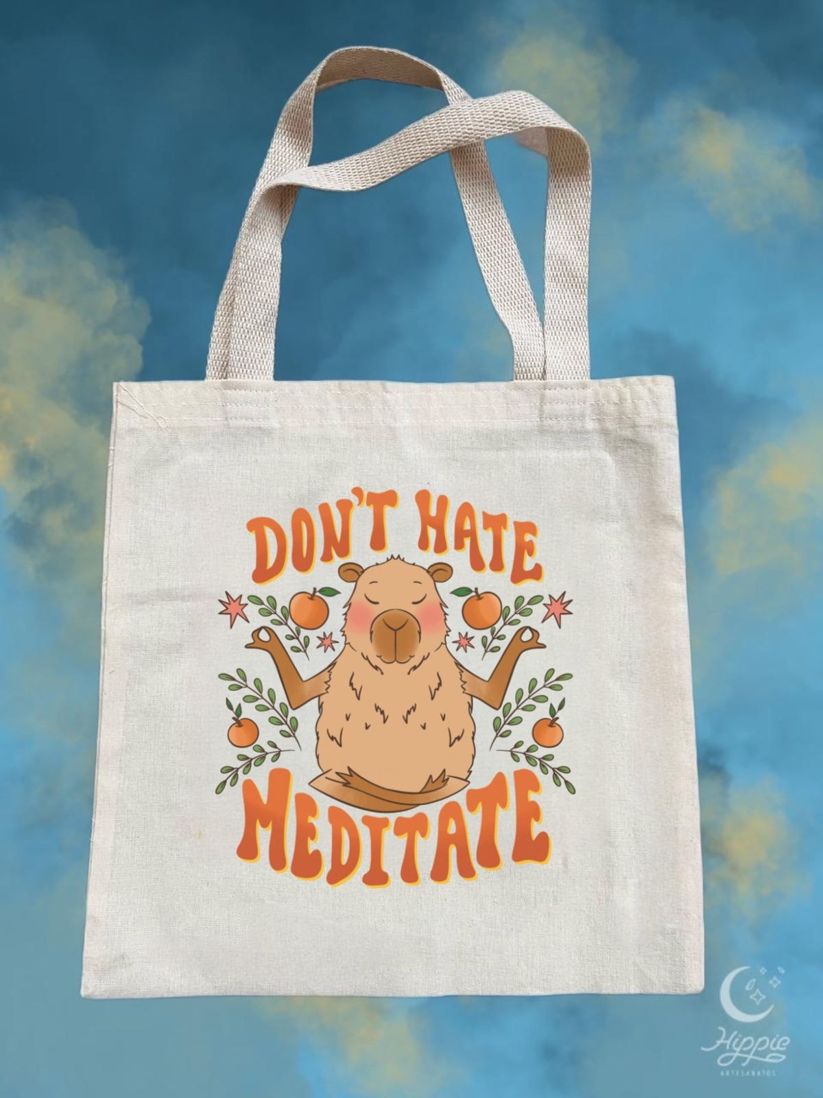 A ecobag Don’t Hate Meditate traz uma mensagem que traduz o que as capivaras nos ensinam com seu modo de viver.