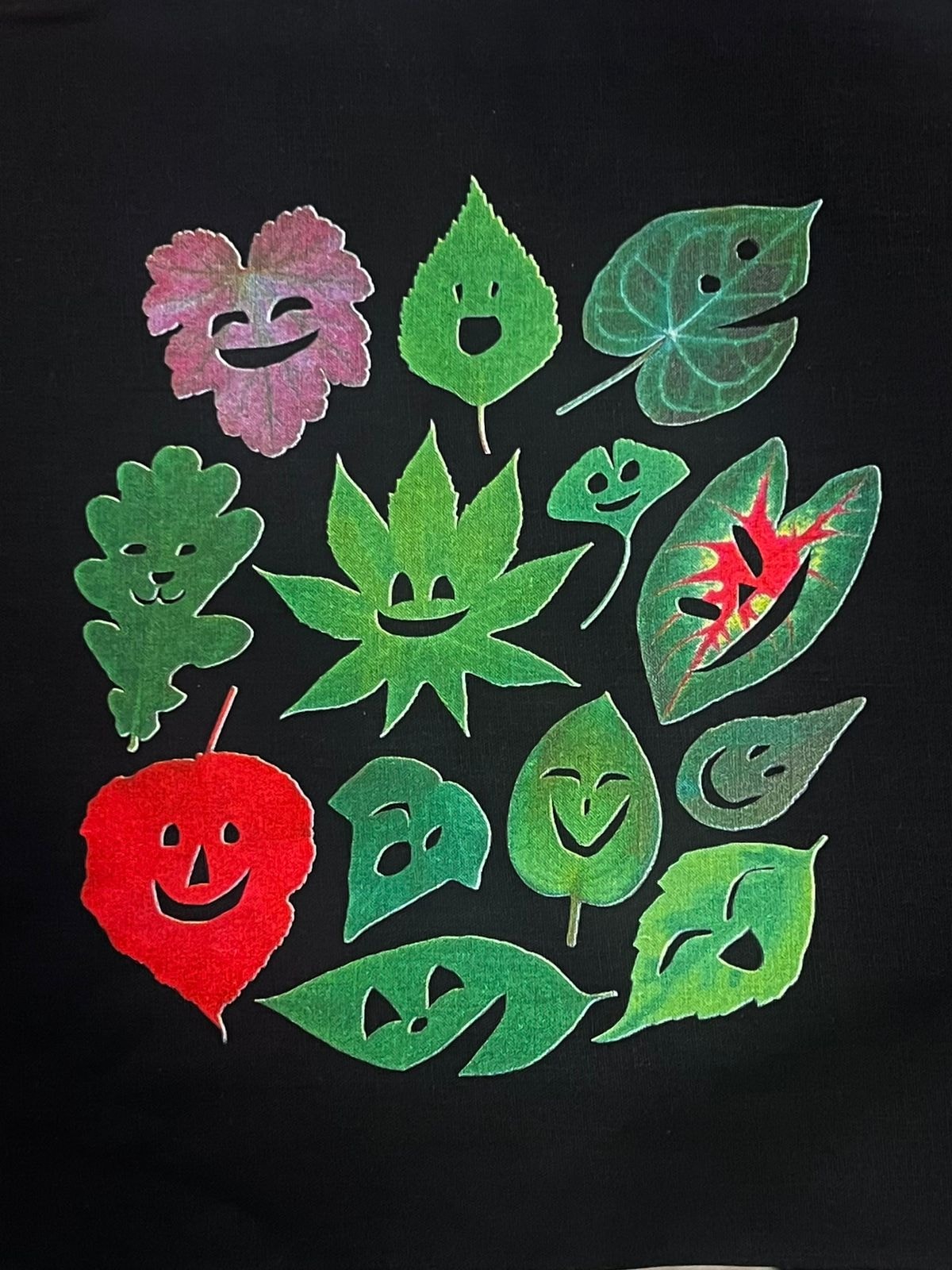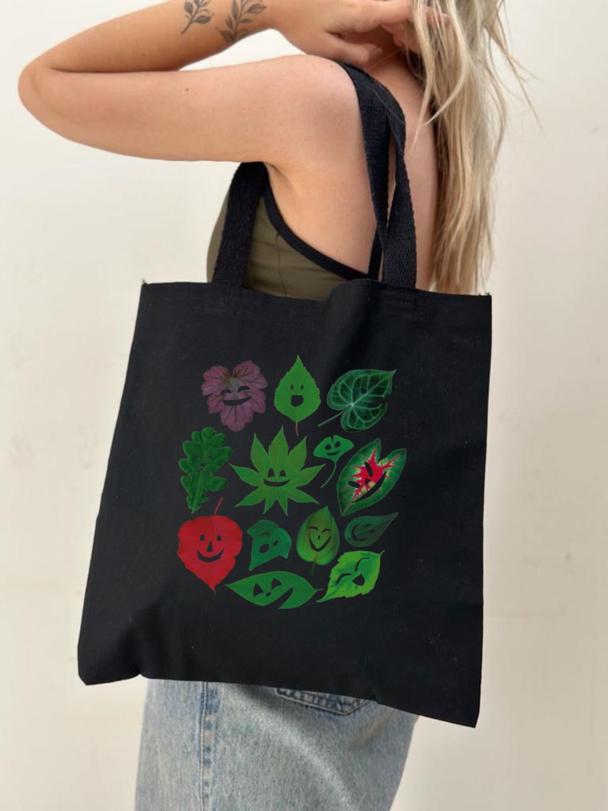 A ecobag Folhas Felizes traz um pedacinho de alegria e natureza para o seu dia, com folhas coloridas e rostos radiantes.
