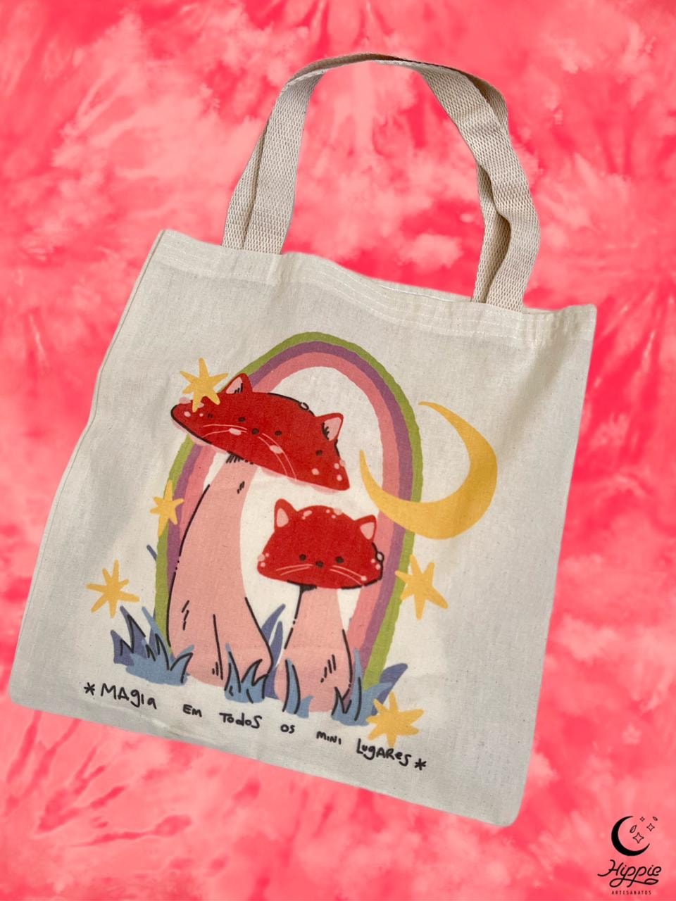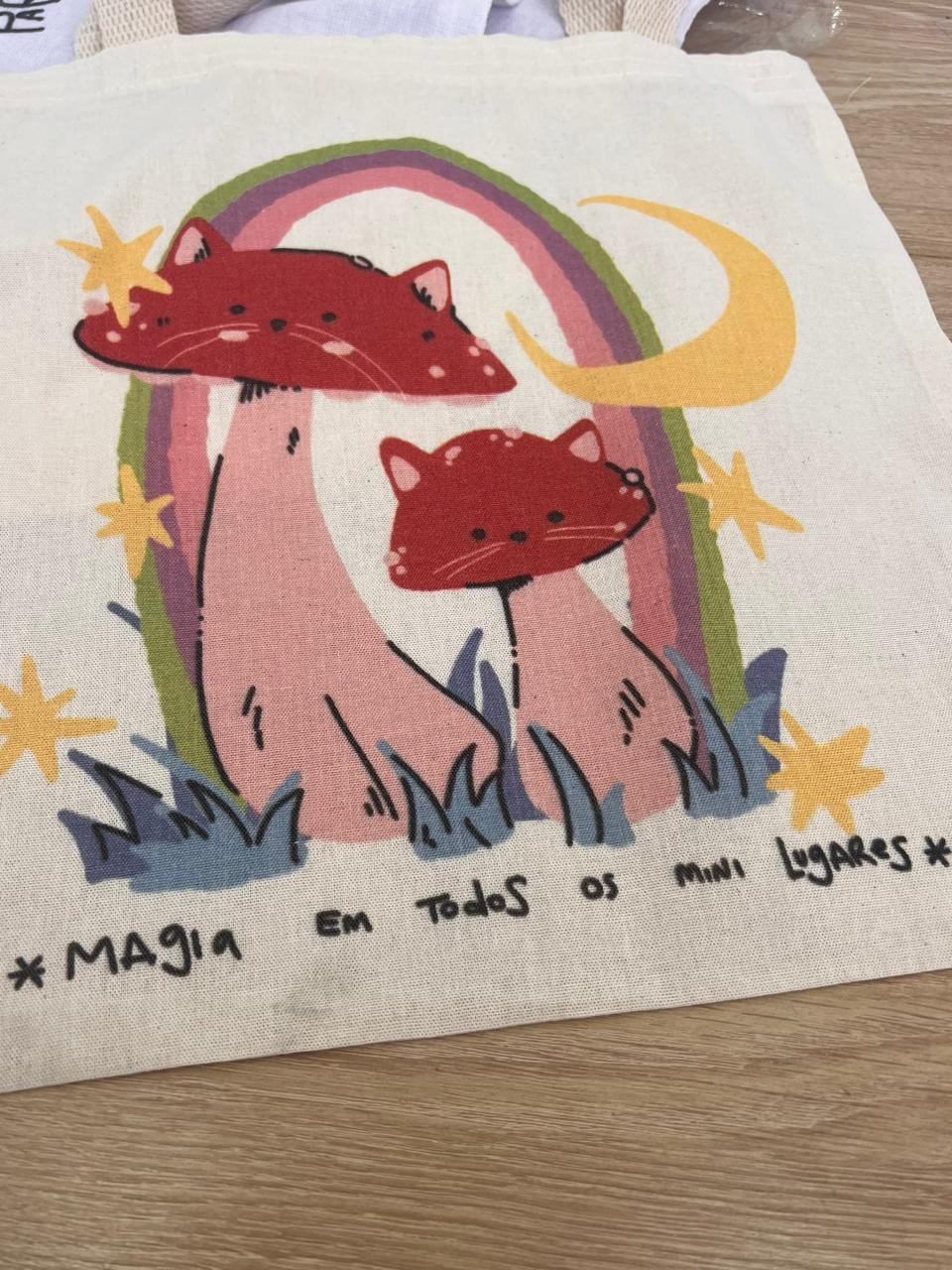 A ecobag Gatinho Cogumelo Mini Lugares usa a imagem deste animal místico misturado a cogumelos, para nos dizer que há magia em todos os minis lugares.