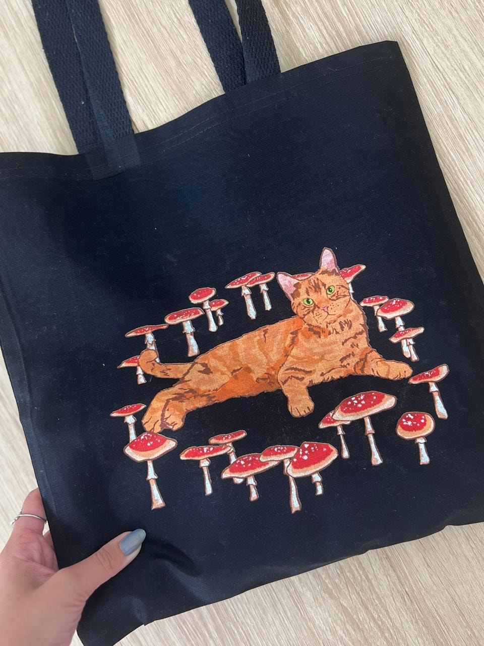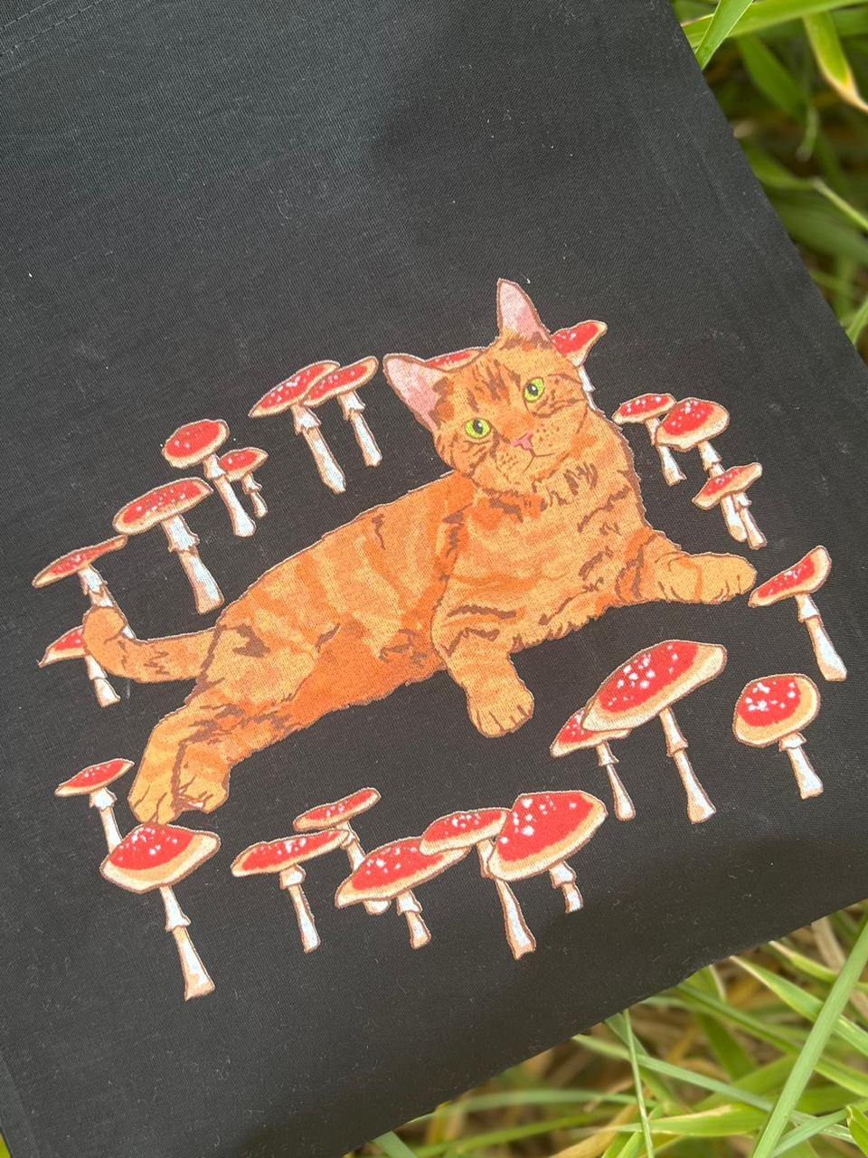 A ecobag Gato e Cogumelo reúne o animal ao fungo, vivendo em harmonia, ambos com significados encantados e profundos.