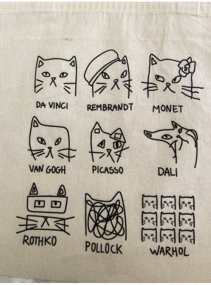A ecobag Gatos Art é uma homenagem aos felinos que nós amamos tanto. Nessa ecobag, os gatos são representados a partir da identidade visual dos artistas Da Vinci, Monet, Rembrandt, Van Gogh, Picasso, Dali, Rothko, Pollock e Warhol.