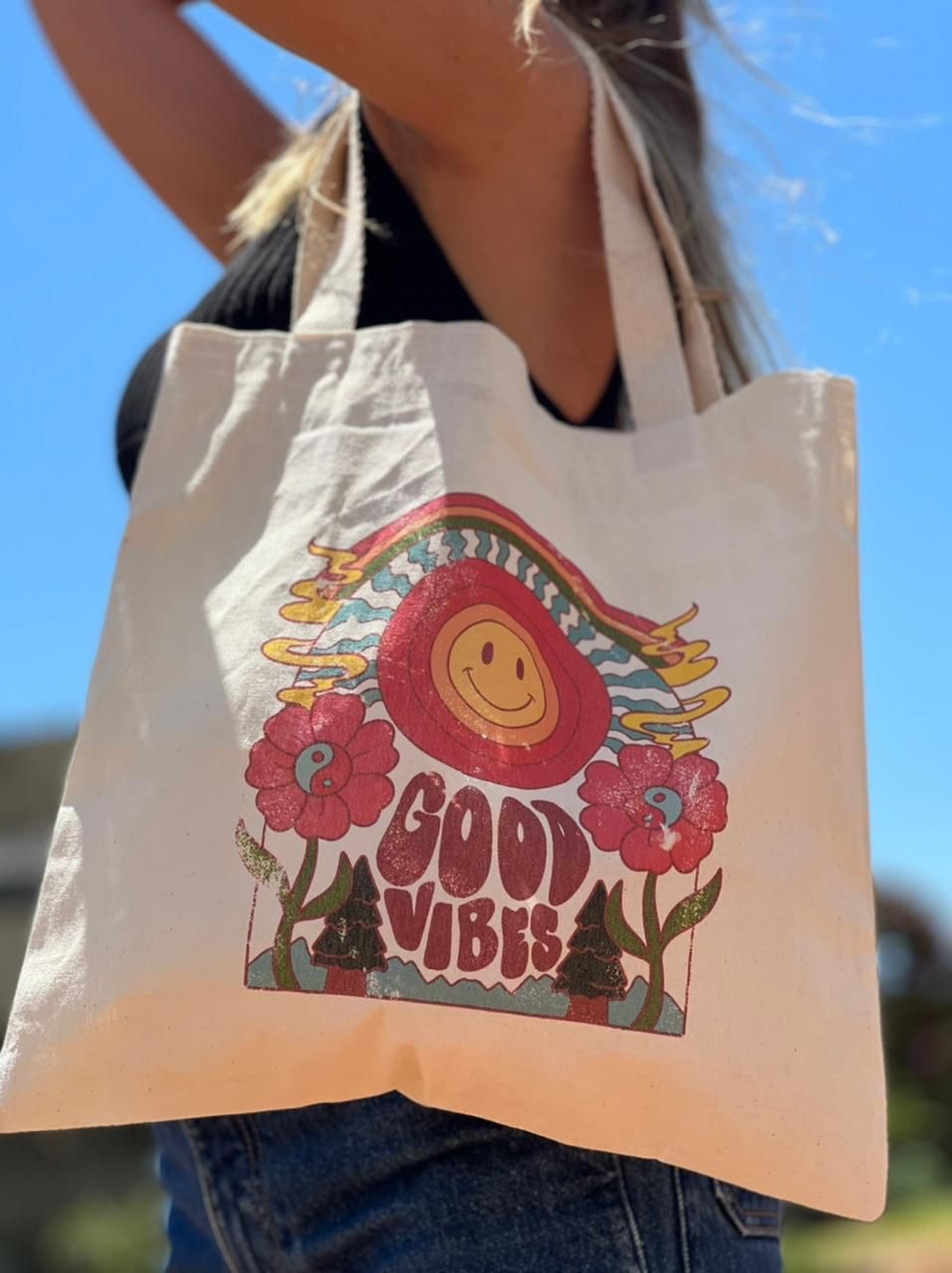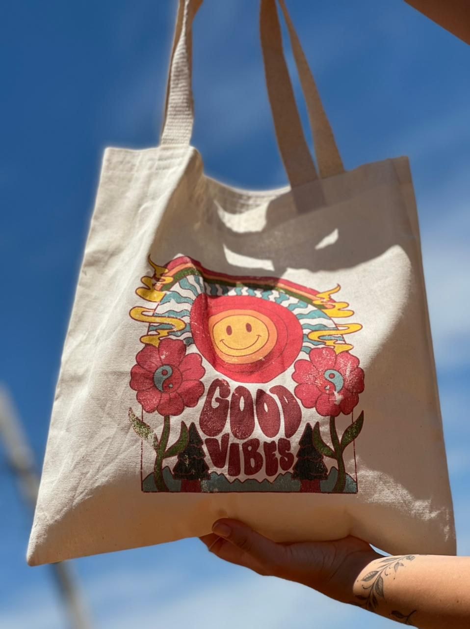 A ecobag Good Vibes é colorida e alegre como são as boas vibrações.