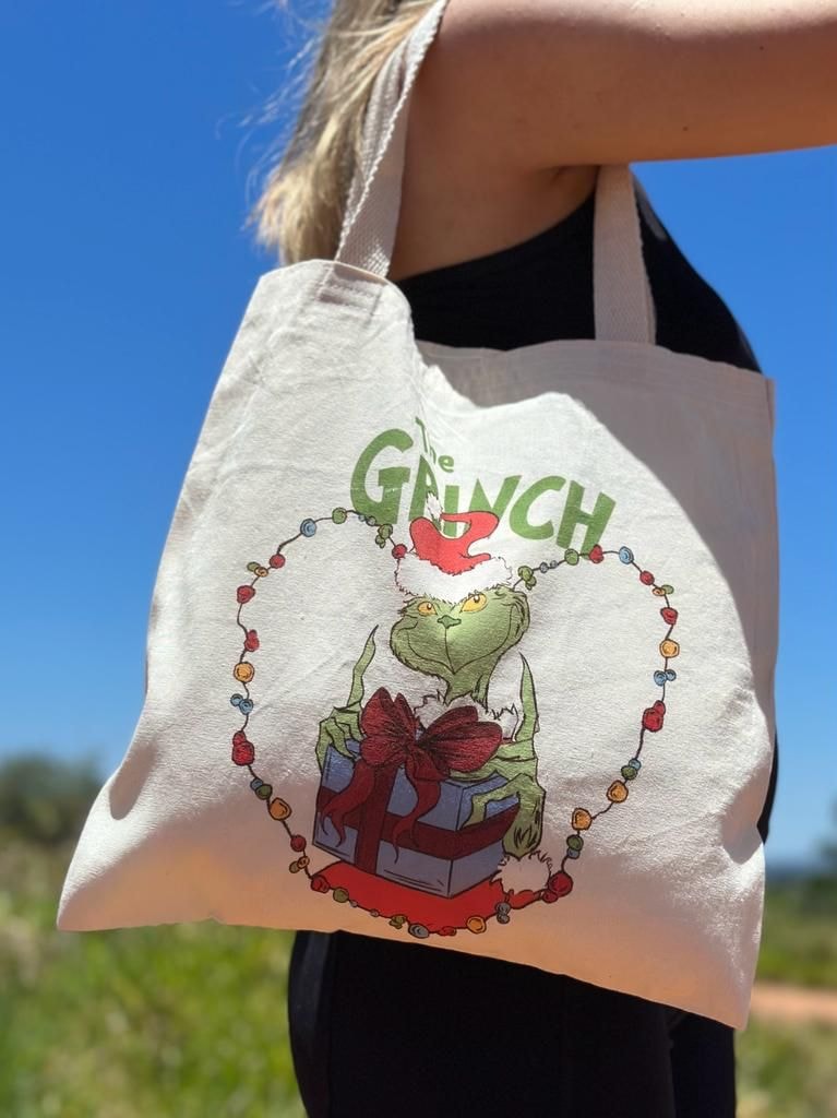 Grinch é uma criatura verde, ranzinza e peluda que vive em Quemlândia, cidadezinha das montanhas onde todo mundo é feliz - menos o próprio Grinch. Ele tem um coração duas vezes menor que os outros habitantes de Quemlândia, e acredita que é isso que o faz tão carrancudo. Mas a verdade é que até os mais mal-humorados não escapam da magia do natal. A ecobag Grinch é uma homenagem a este personagem icônico que jura ser inimigo da alegria natalina, mas descobre que, no fundo, tem sim um grande coração <3