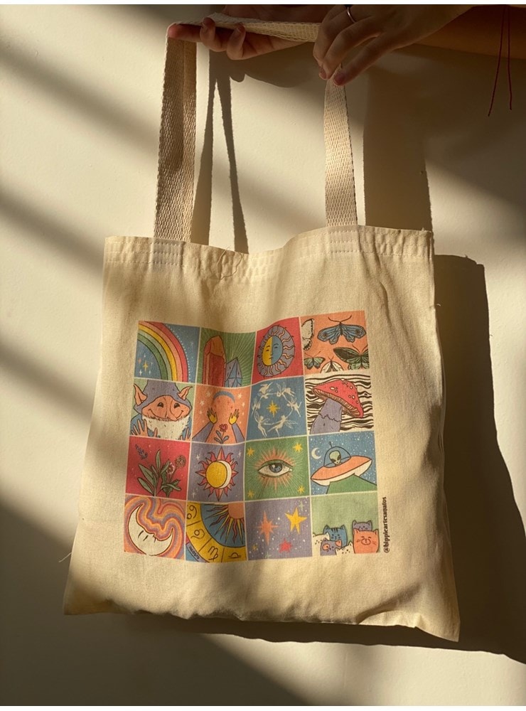 A ecobag Hippie Day reúne símbolos e elementos relacionados à cultura e ao estilo de vida hippie.