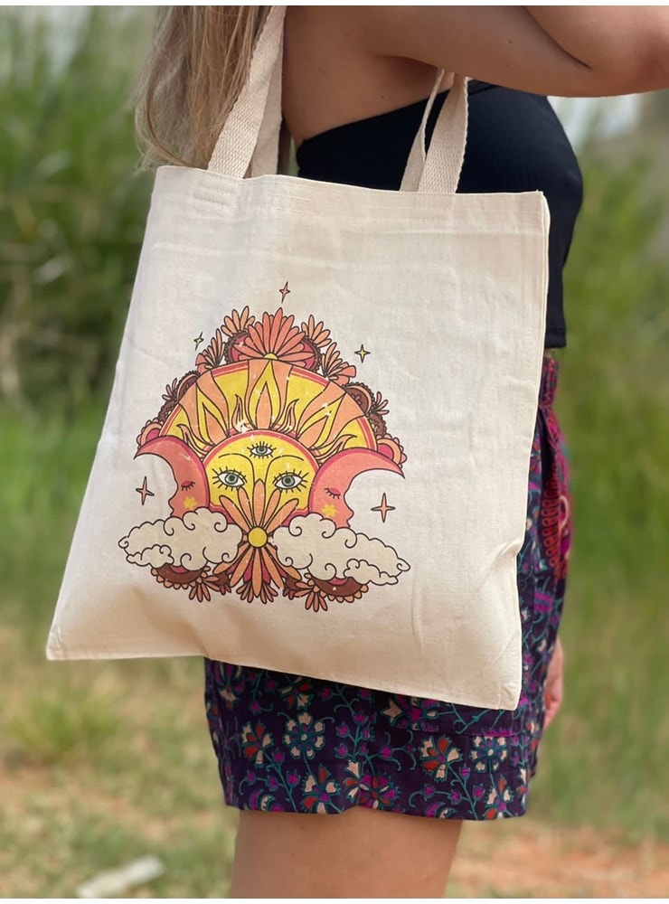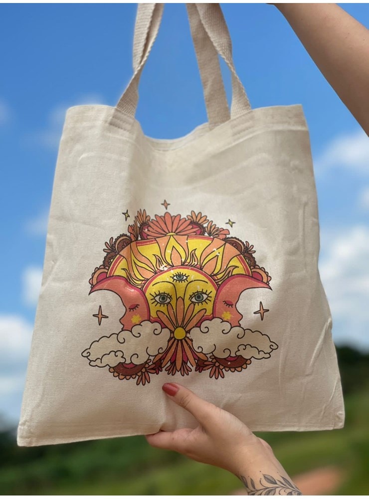 A ecobag Intuição é estampada com o Sol e a Lua, essas forças opostas e complementares, que nos guiam e nos trazem mensagens e ensinamentos importantes que nos conectam ao nosso poder intuitivo.