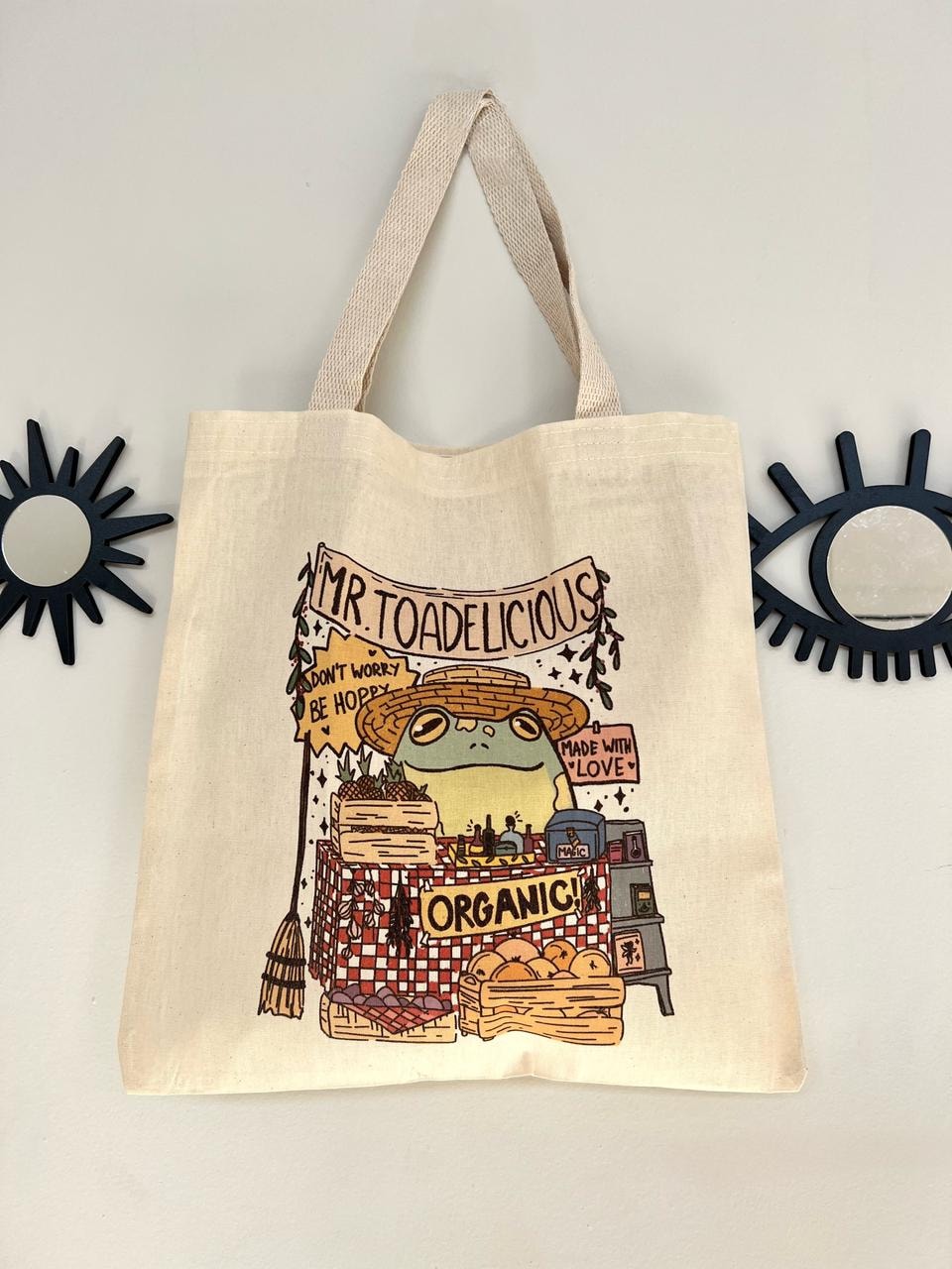 A ecobag Loja do Sapo é estampada com uma barraca linda do sapo feirante, recheada de produtos orgânicos e deliciosos.