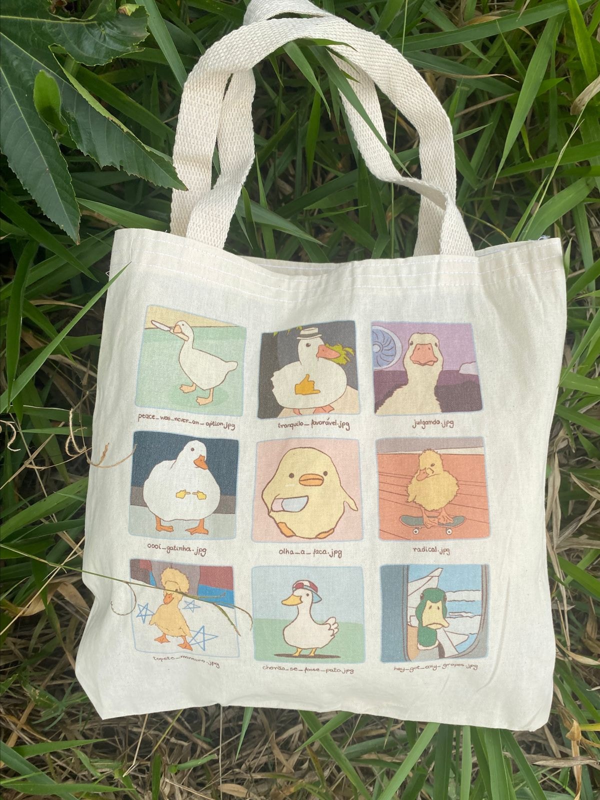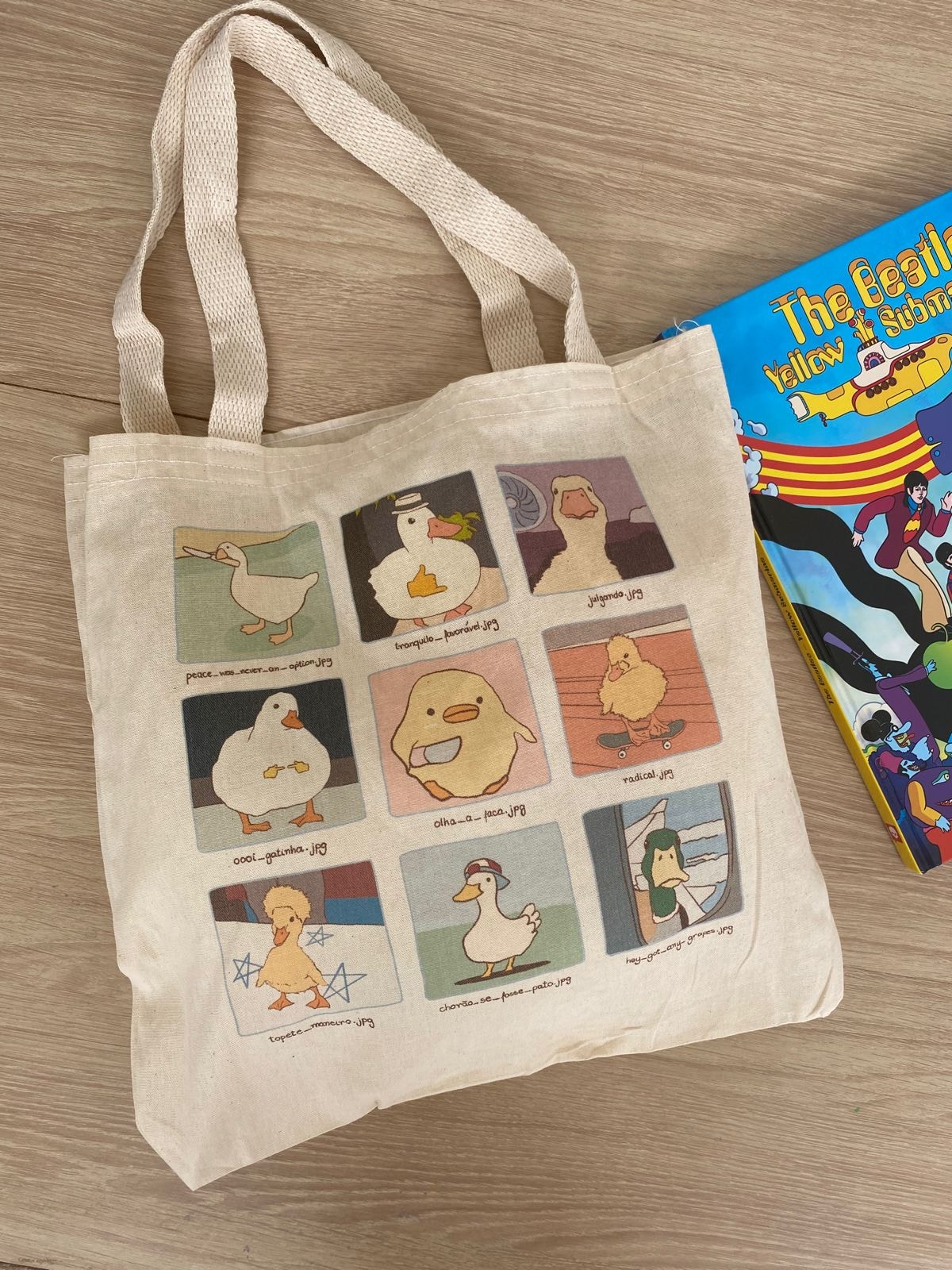 A ecobag Memes de Pato é estampada com patos em vários moods que nos representam no dia a dia.