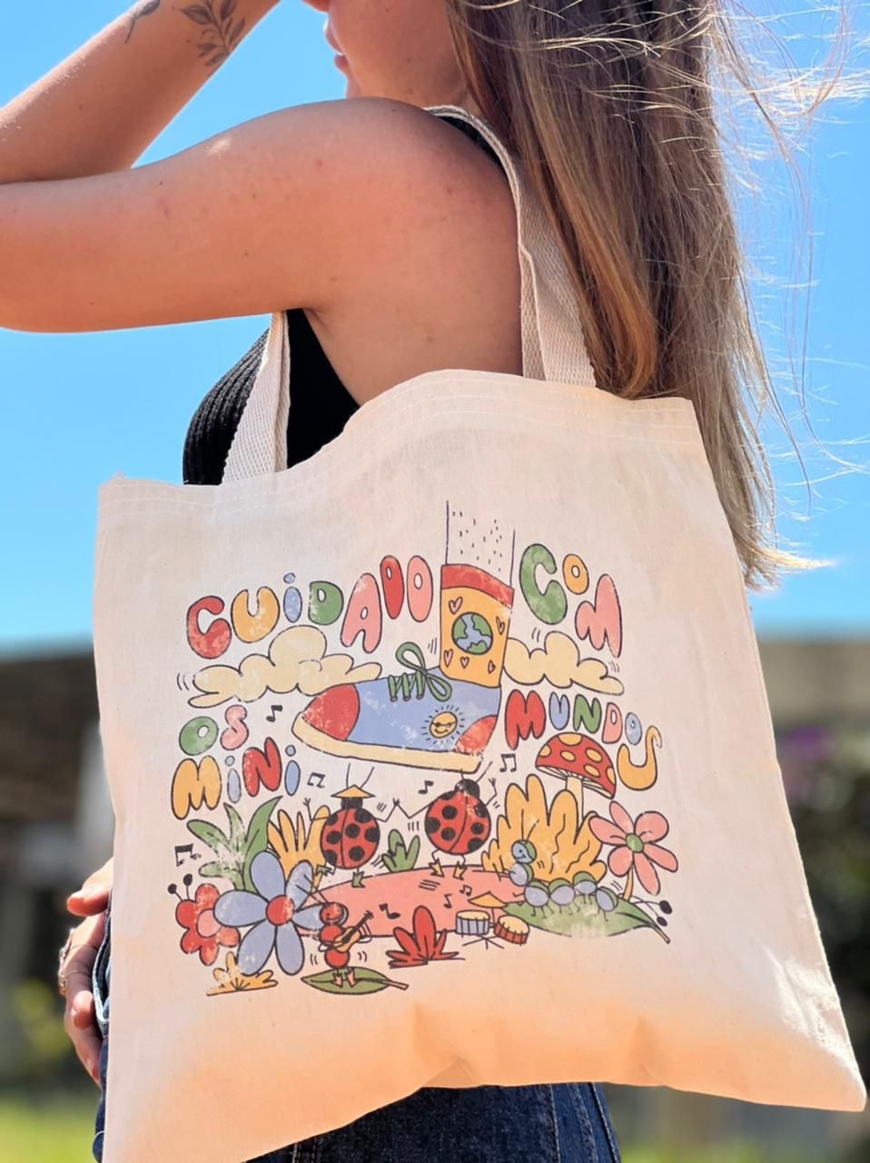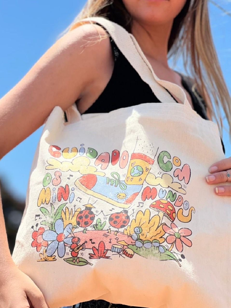 A ecobag Mini Mundo é um lembrete sobre esse universo cheio de pequenos habitantes que não param de trabalhar para a manutenção do ecossistema.