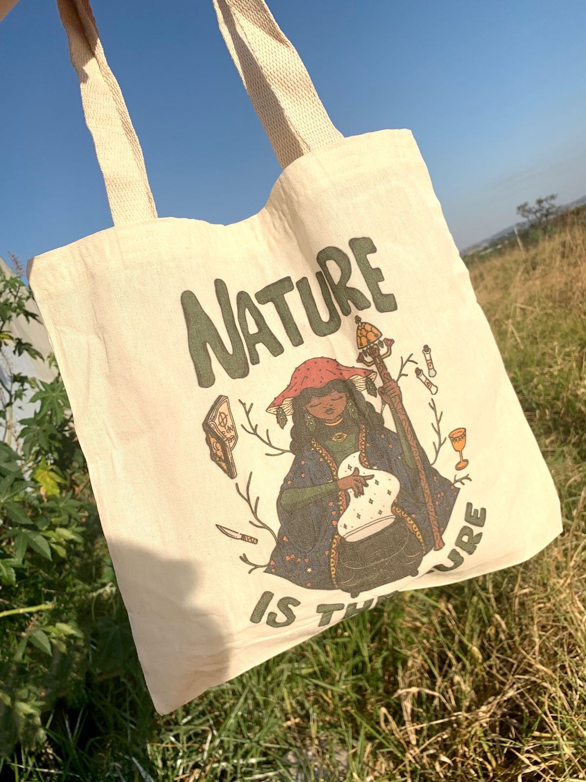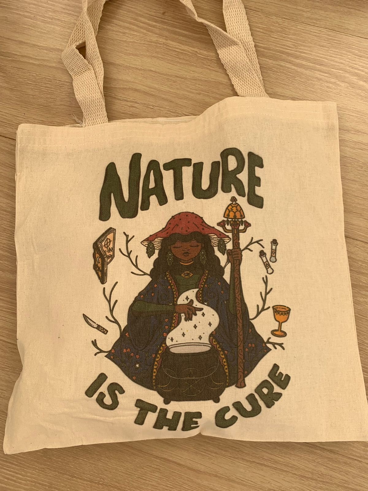 A ecobag Nature Is The Cure traz em sua estampa a imagem de uma bruxa fazendo magia com os encantos da natureza.