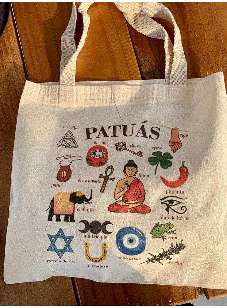 A ecobag Patuás traz a representação de símbolos e objetos considerados talismãs protetores em diferentes culturas.