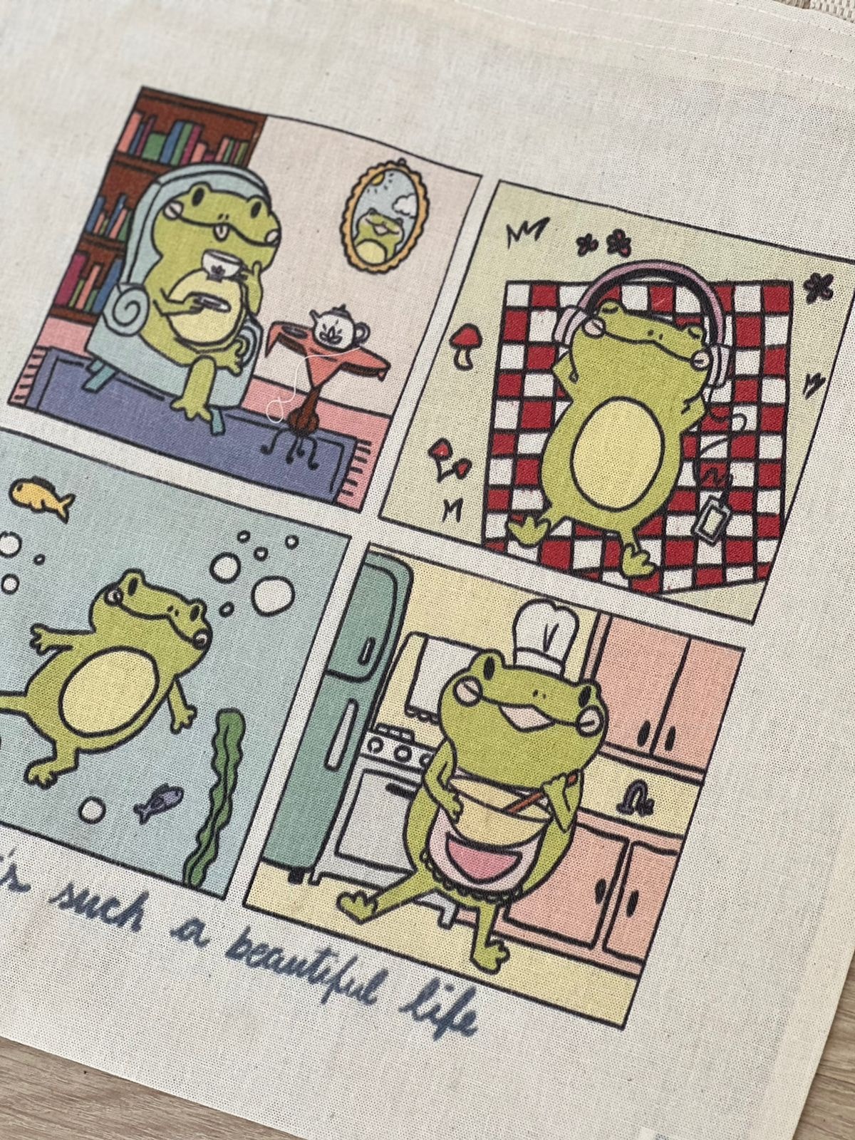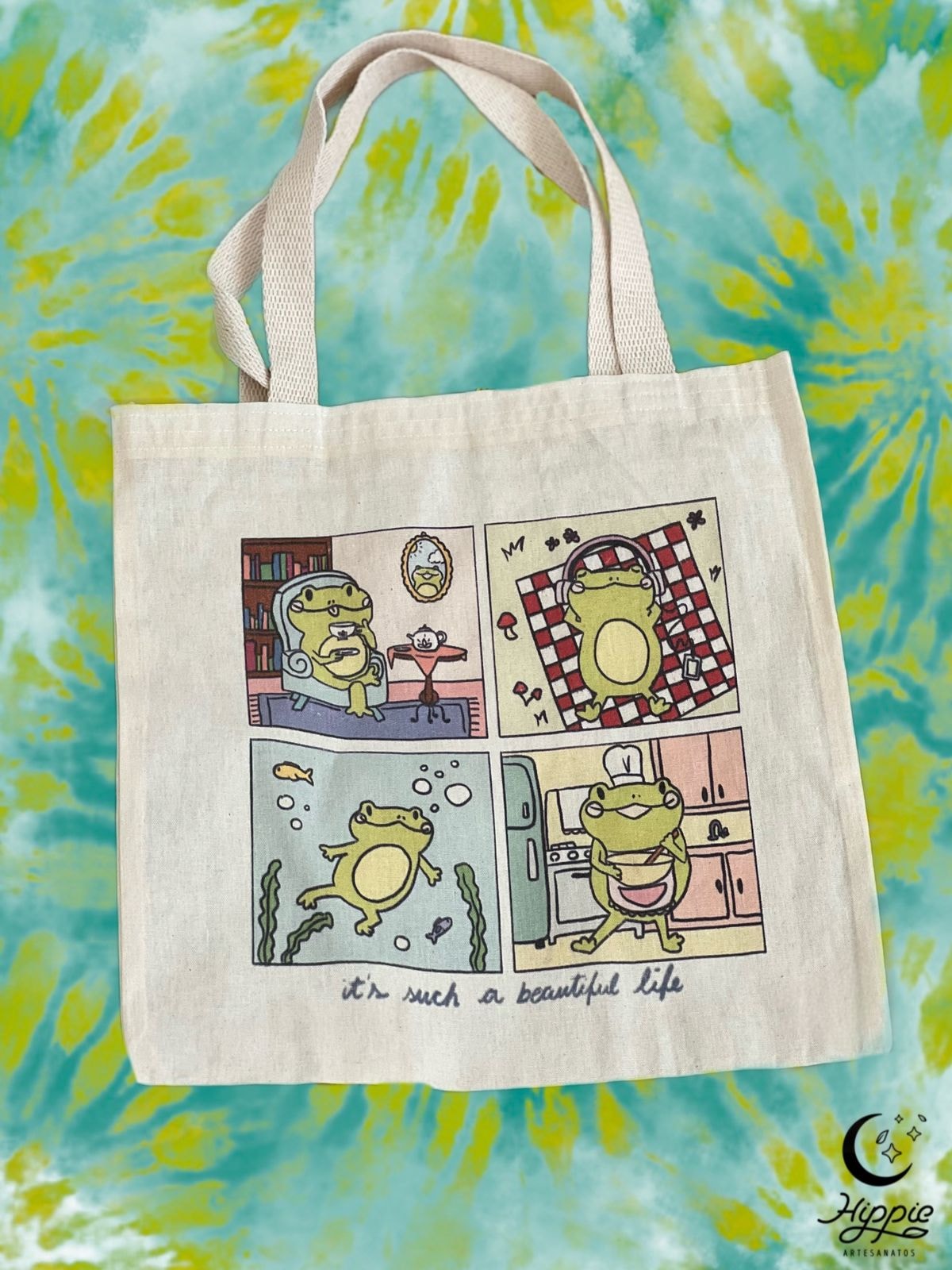 A ecobag Sapinho Beautiful Life é ilustrada com um sapinho tendo a vida bela e mansa que queríamos para nós.