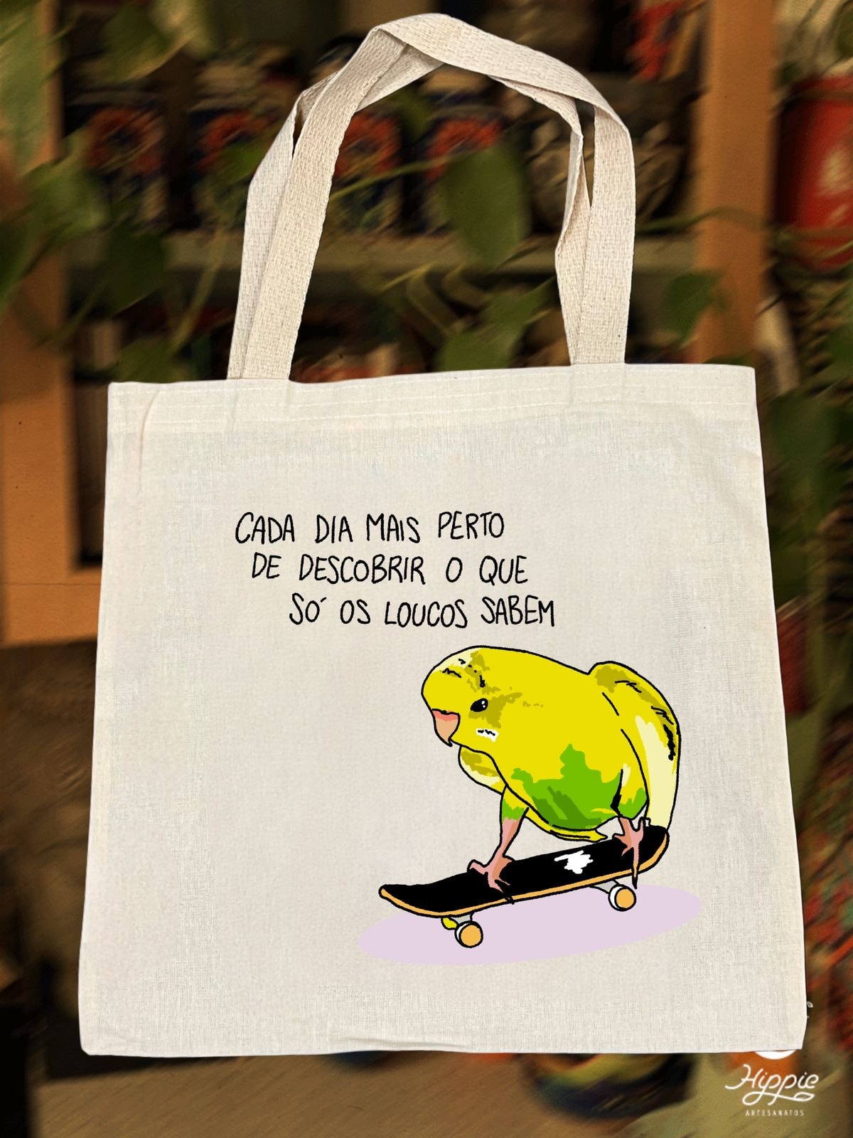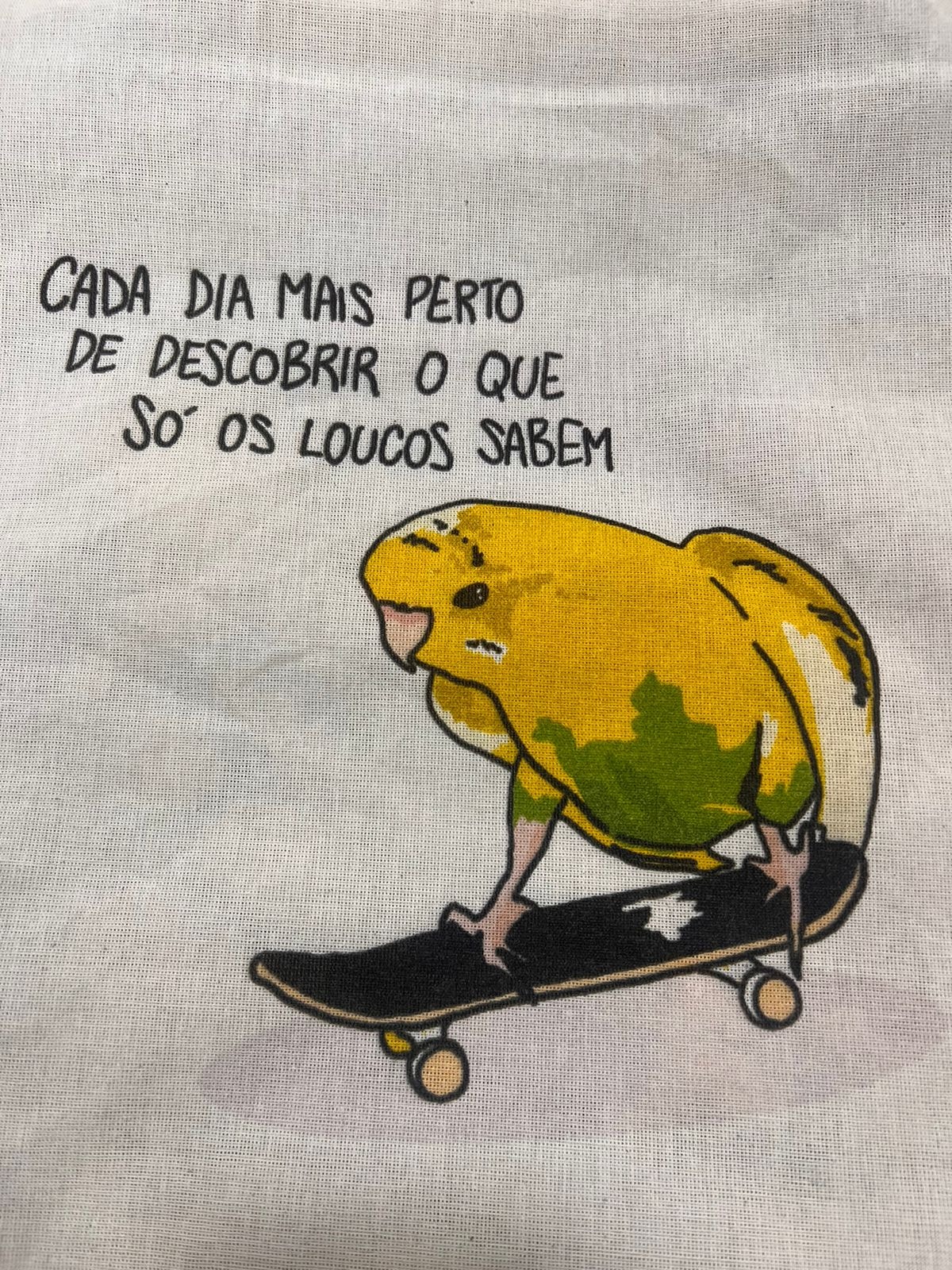 Cada dia mais perto de descobrir o que só os loucos sabem. A ecobag Só Os Loucos Sabem é estampada com um canário skatista reflexivo.