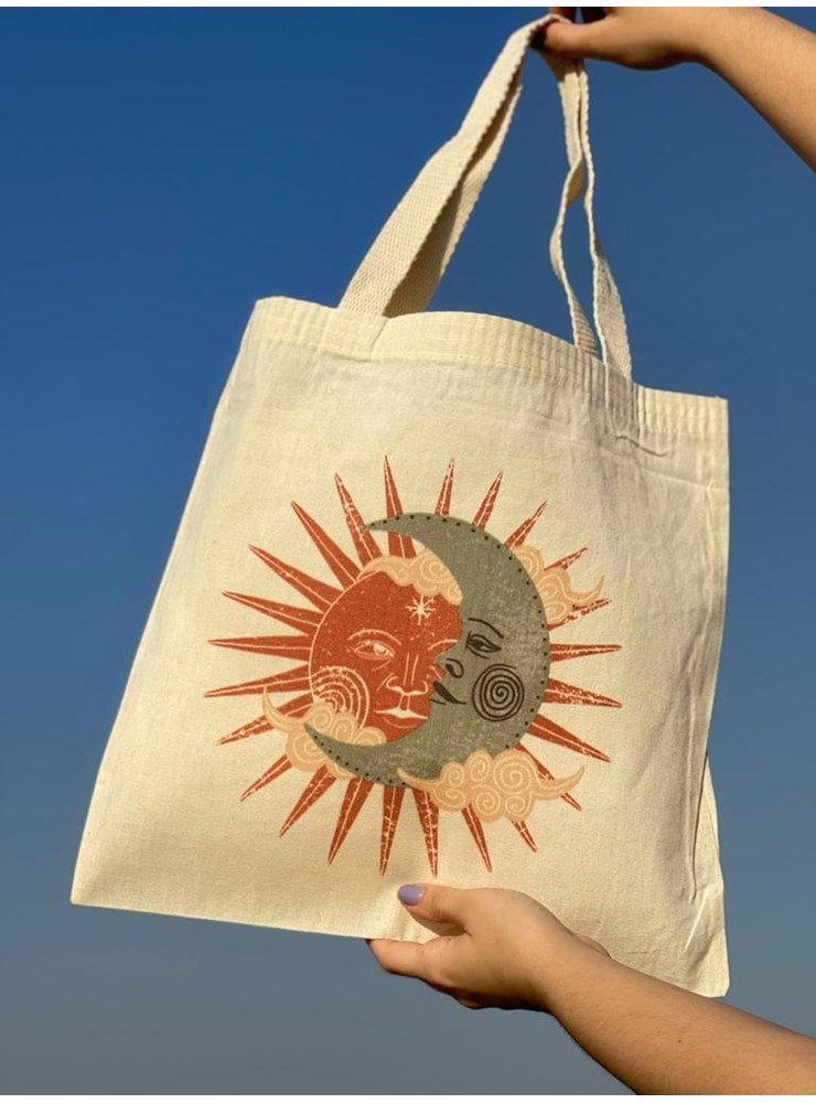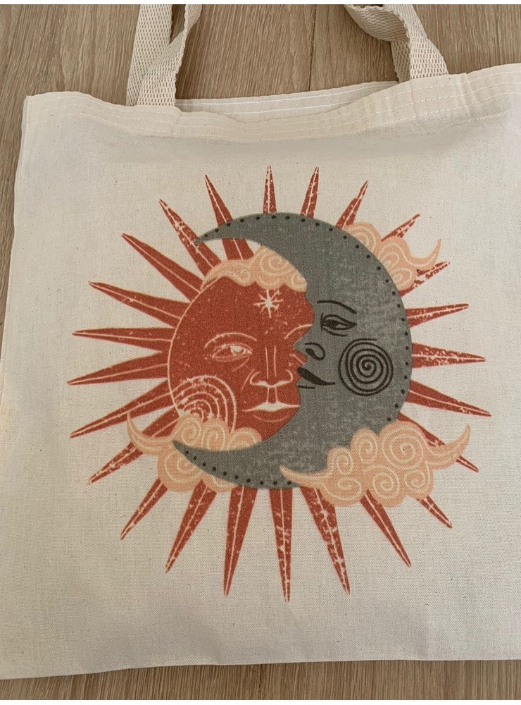 A ecobag Sol e Lua Vintage é ilustrada com estes corpos celestes que representam forças opostas, mas que se complementam.
