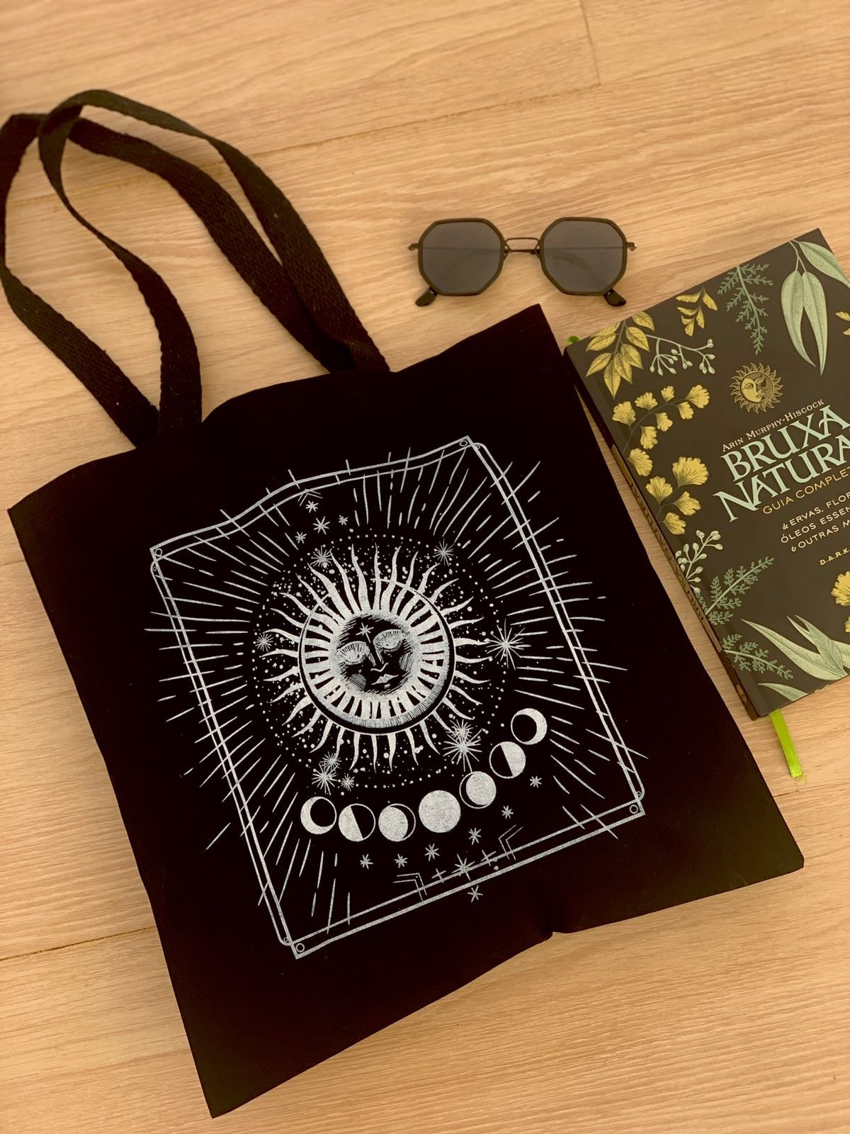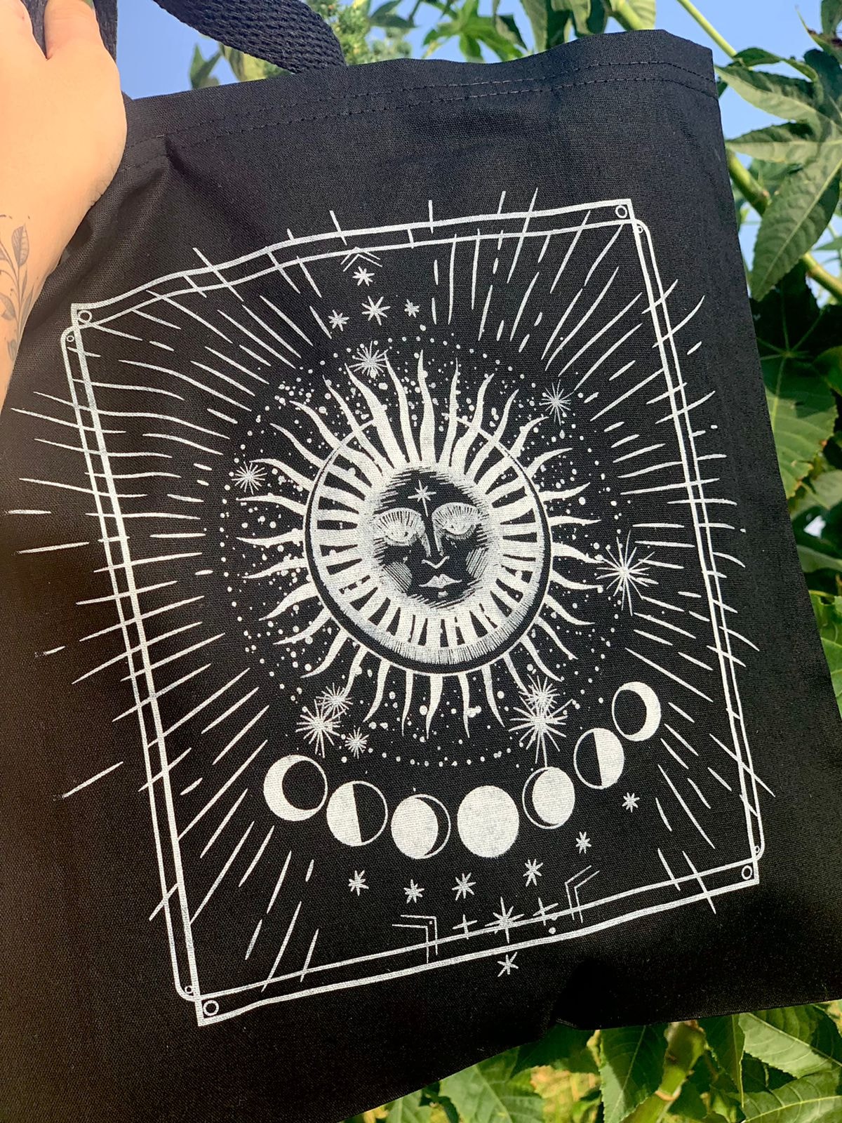 Símbolos escolhidos para a composição: Sol: É o princípio masculino. Se conectar com as propriedades do sol é uma importante fonte de inspiração para que sejam construídas bases emocionais sólidas dentro de si. Lua: Como para tudo existe um oposto, a ecobag Solar também representa a lua, simbolizando a importância do equilíbrio entre feminino e masculino, razão e emoção, luz e sombra. A lua fala sobre olhar para o nosso Eu interior e reconhecer nosso lado intuitivo e perceptivo.