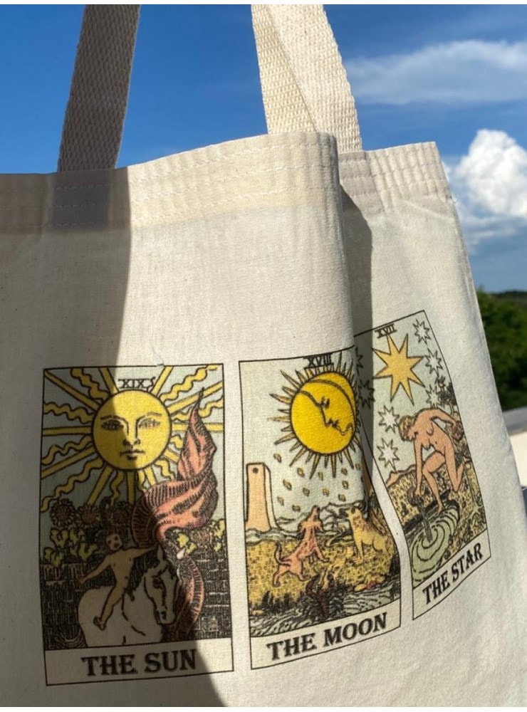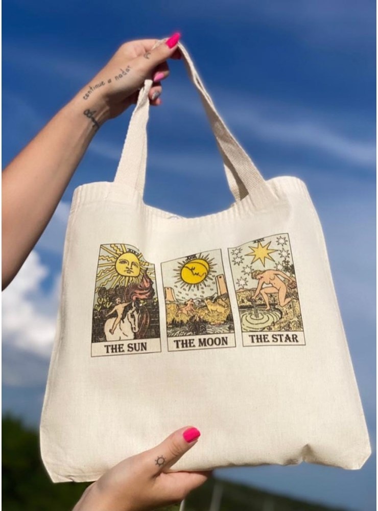 Símbolos escolhidos para a composição: O Sol: Esta carta representa otimismo, sucesso, felicidade e vitalidade. Traz todo o brilho do astro rei e indica um momento de alegria de viver, de se nutrir do que há de bom no caminho. A Lua: Este arcano fala sobre intuição, imaginação e inconsciência. Nos aconselha a ter um olhar calmo e profundo sobre as situações. Nos mostra a importância de nos deixar guiar pela nossa intuição. A Estrela: Representa esperança no futuro e fé renovada. Para quem está passando por um momento difícil, é um sinal positivo de que as coisas vão começar a melhorar.