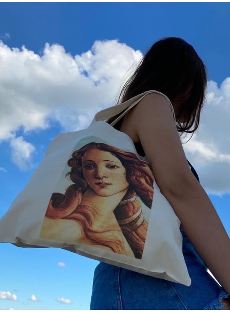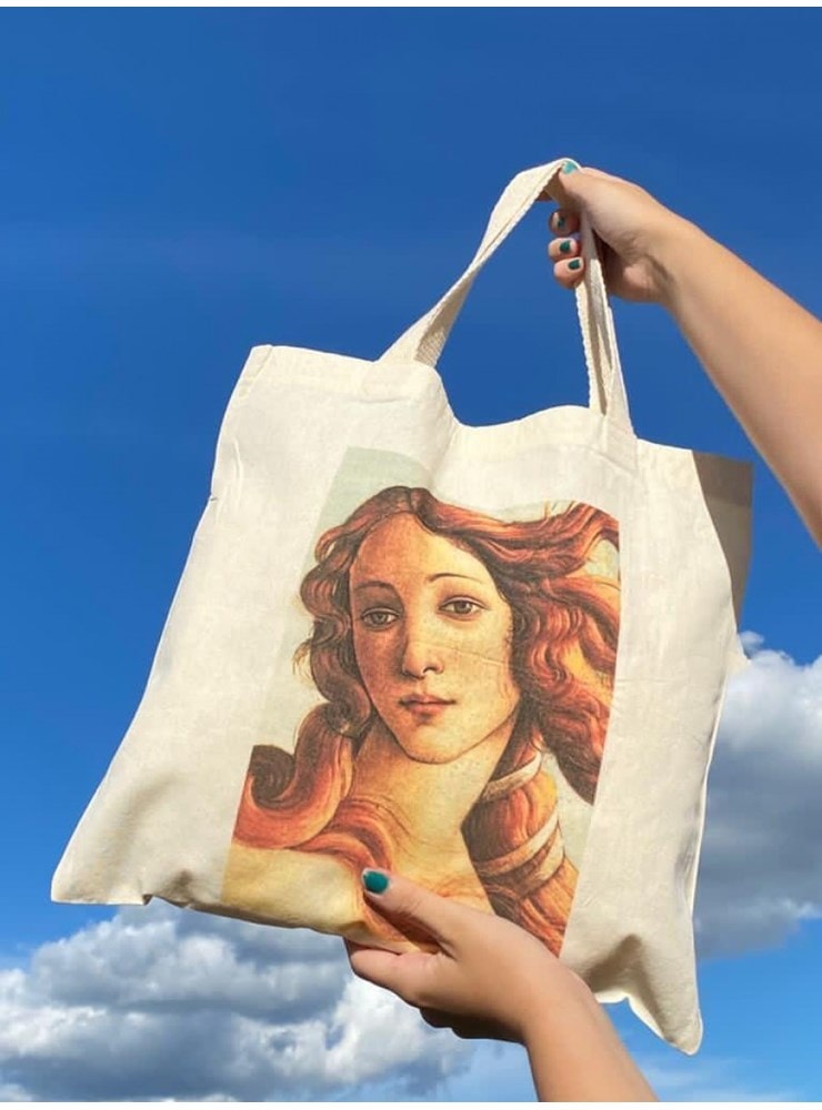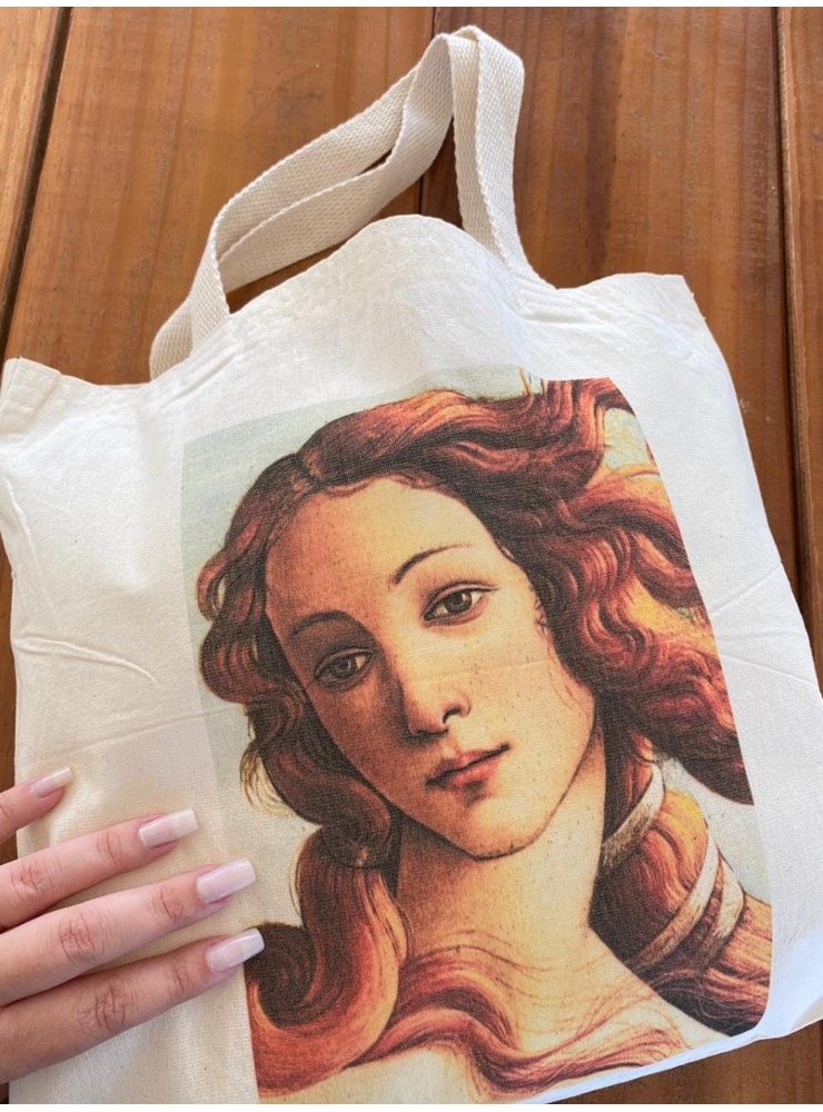 A ecobag Vênus retrata o rosto da deusa pintado no quadro O Renascimento de Vênus de Sandro Botticelli.