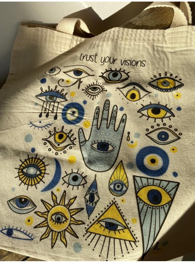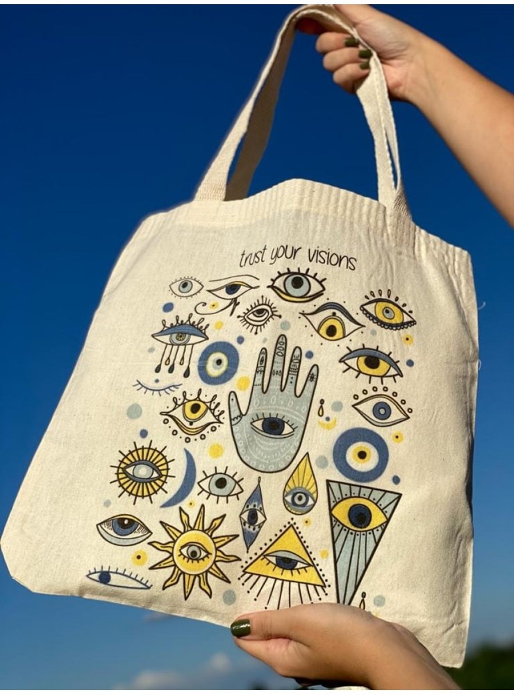 A ecobag Vision 2021 traz o olho como elemento. O olho simboliza as percepções e é considerado o espelho da alma.
