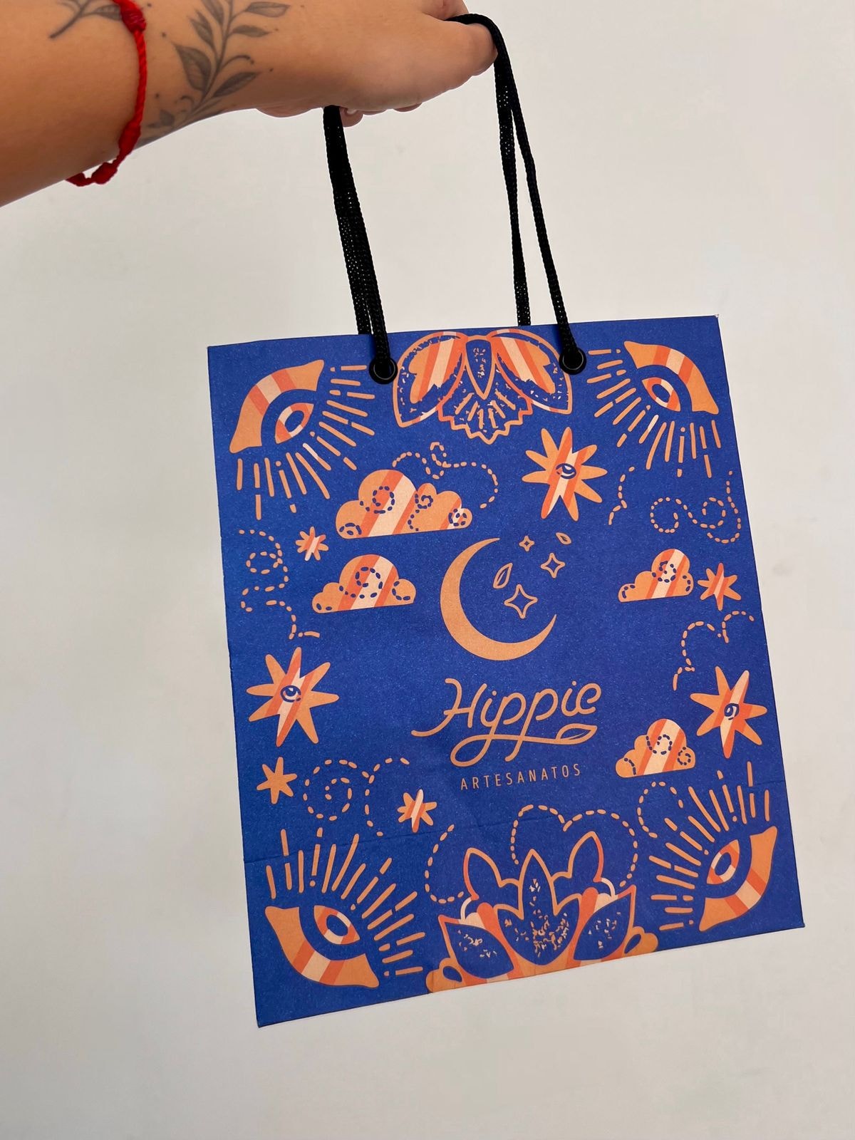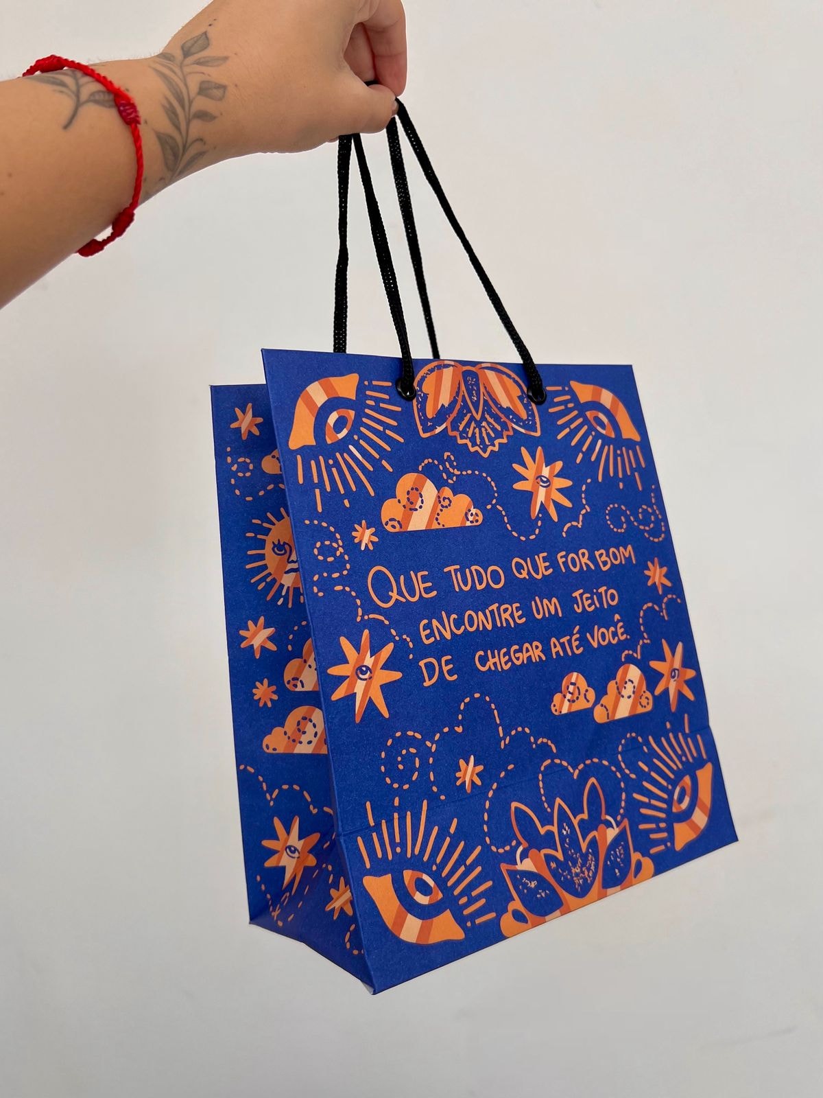 Nossa sacola “Sol Tudo que for bom” é feita em papel resistente, com impressão colorida de alta qualidade e arte exclusiva Hippie Artesanatos.