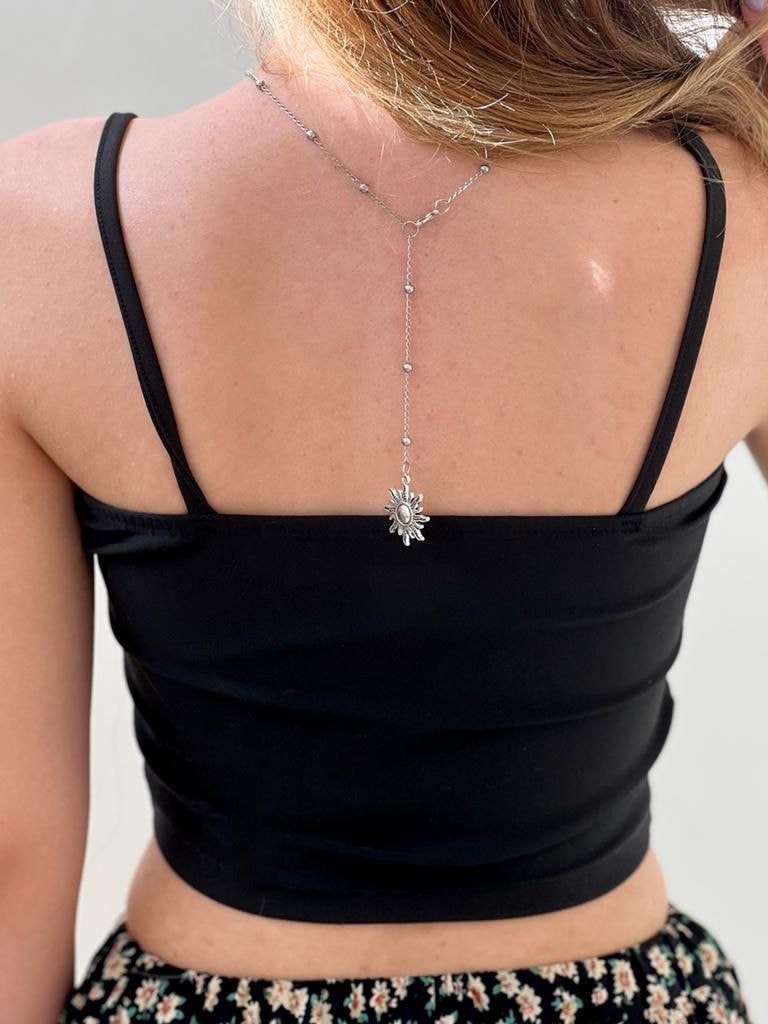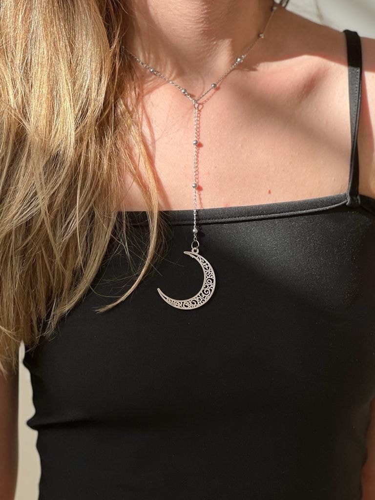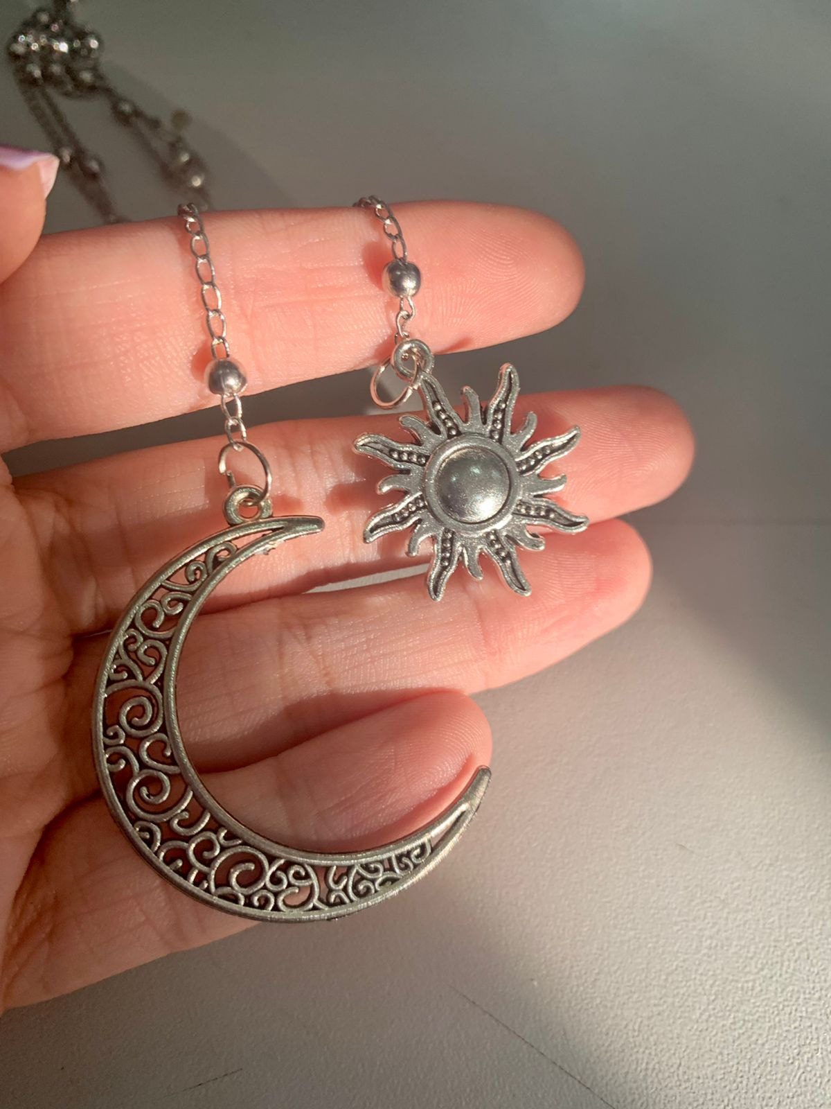 Material: Zamak. Medida: 45cm de comprimento + 8cm de corrente vertical. Lua de 4cm. Sol de 3cm.