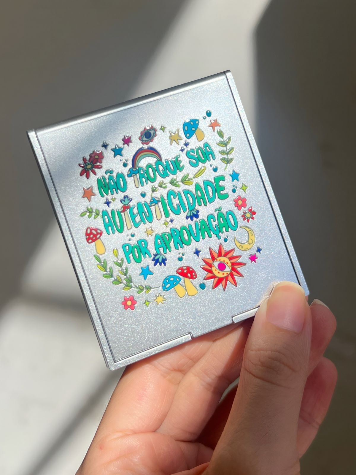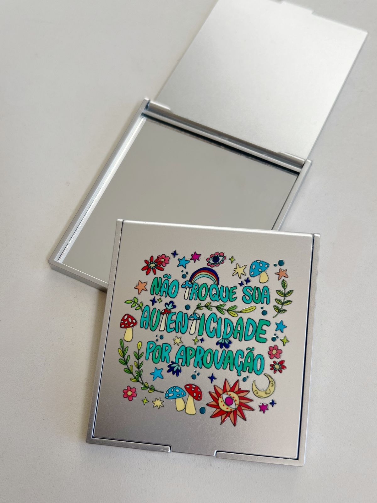 Espelho de bolso com estampa em alta qualidade. Acrílico fosco prateado, 7,5cm x 6,5cm.