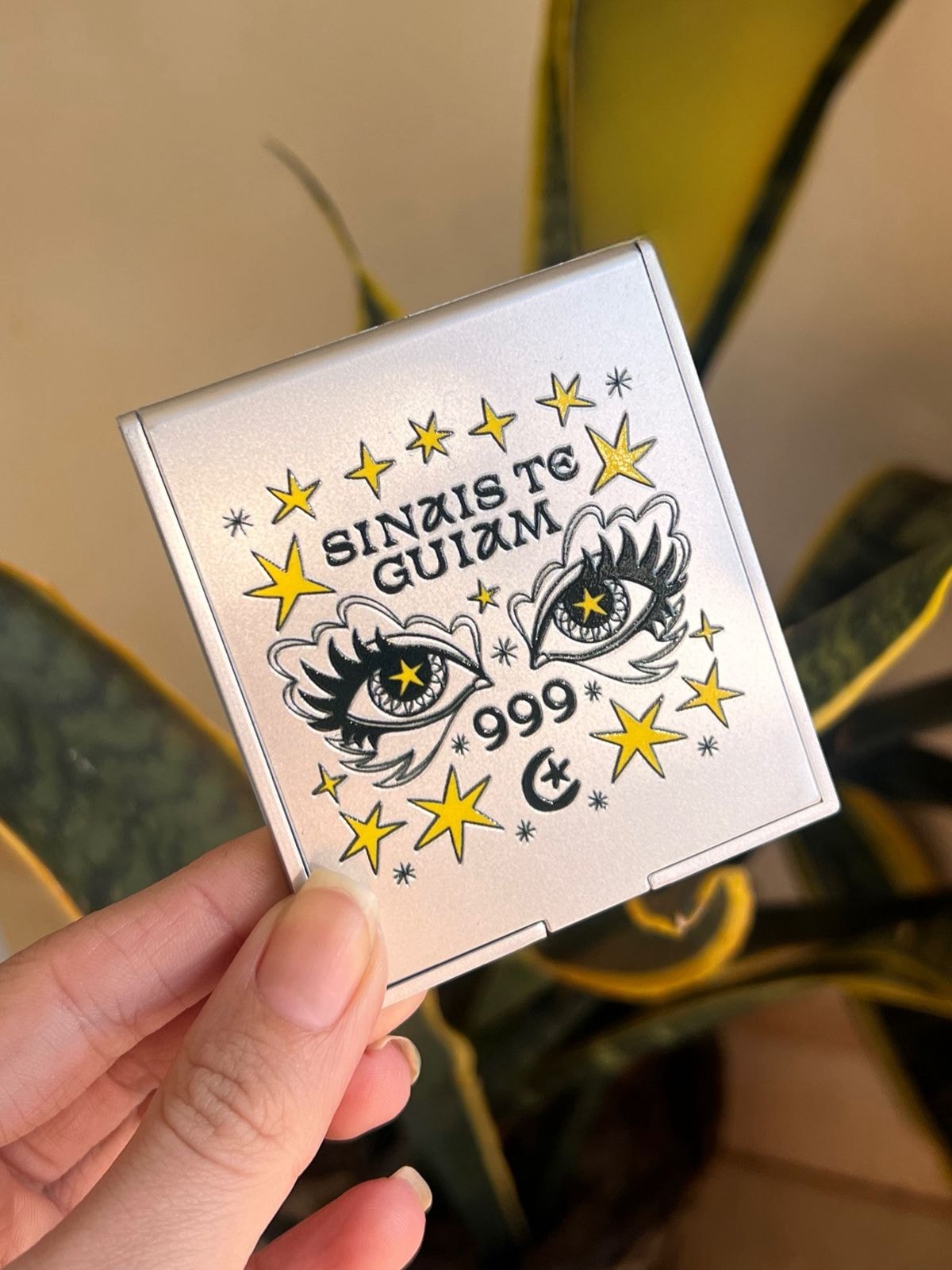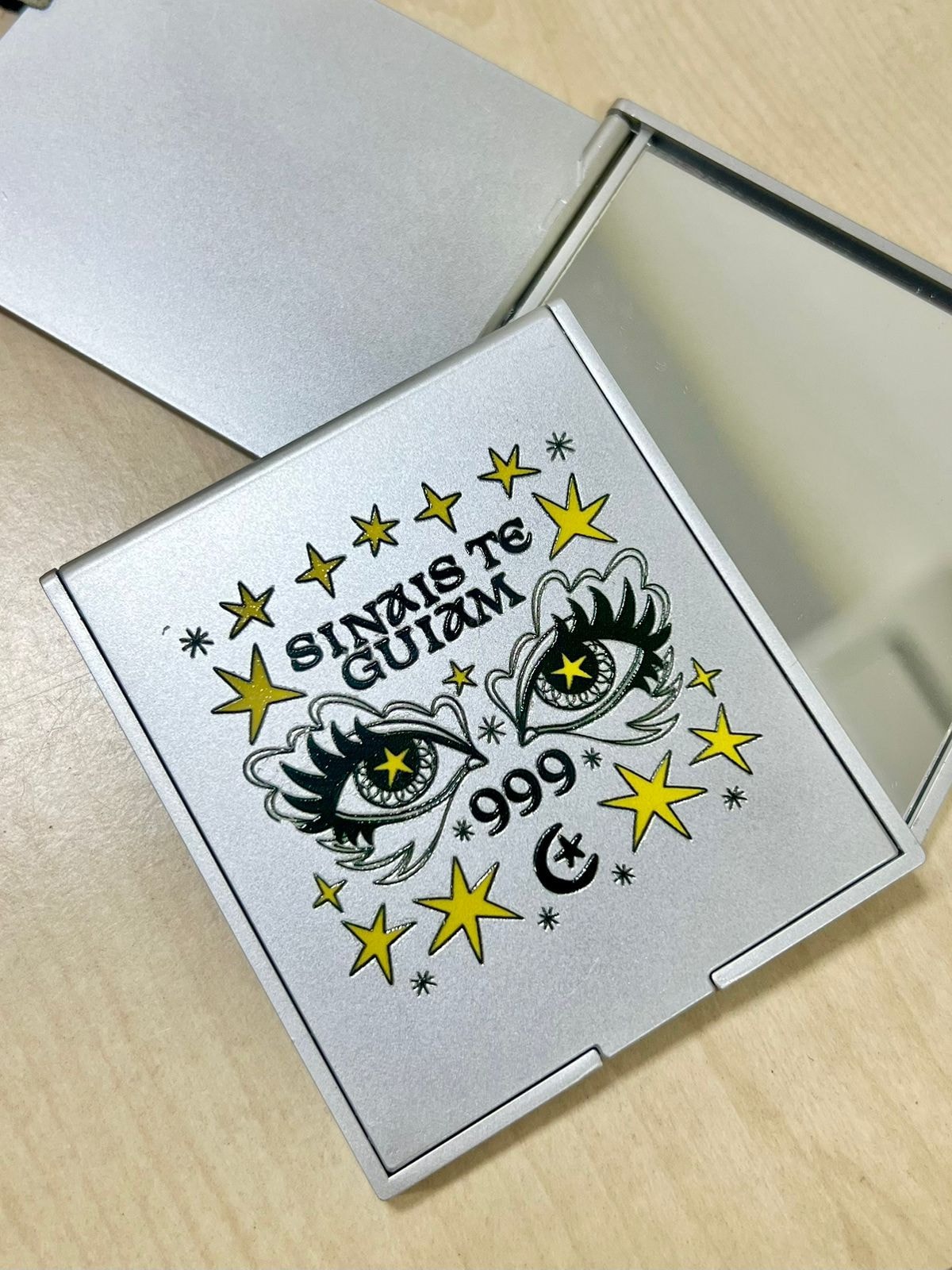 Espelho de bolso com estampa em alta qualidade. Acrílico fosco prateado, 7,5cm x 6,5cm.