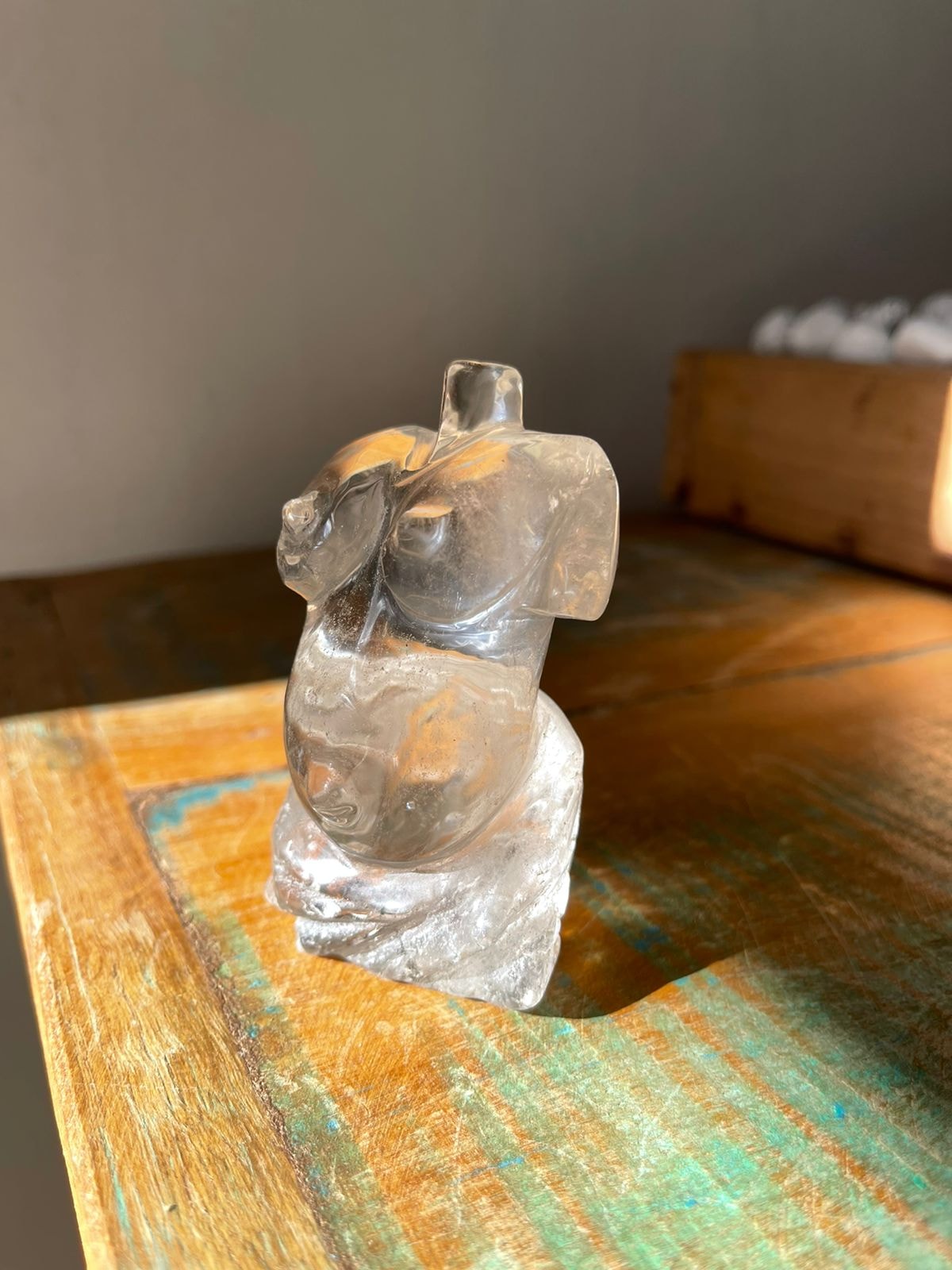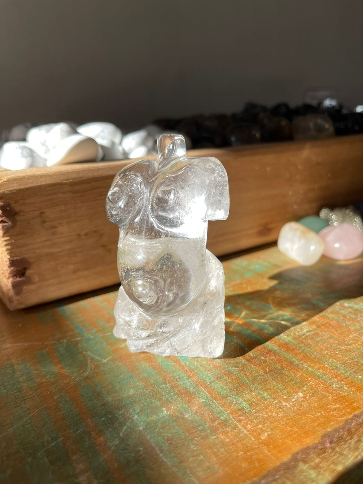 Estatueta de cristal natural, mede 8,5 cm com 5,5 cm de largura.