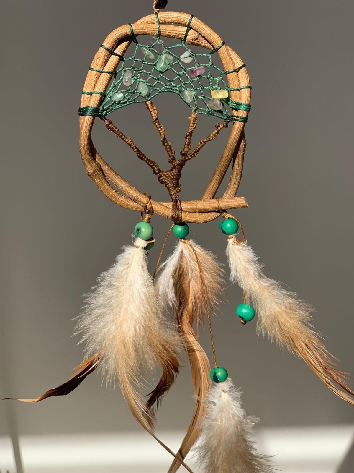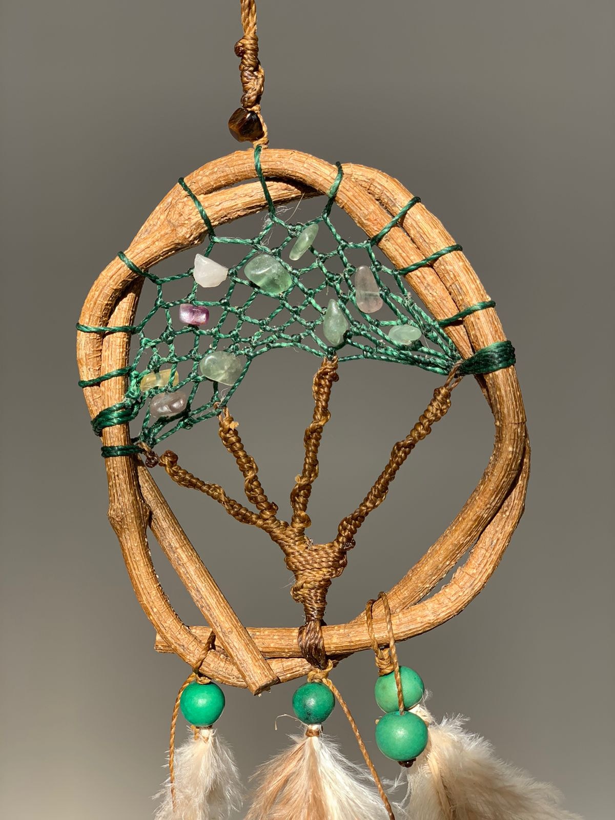 Material: Cipó natural, madeira, sementes de açaí, cordão encerado, penas de queda natural e cristais fluorita naturais.