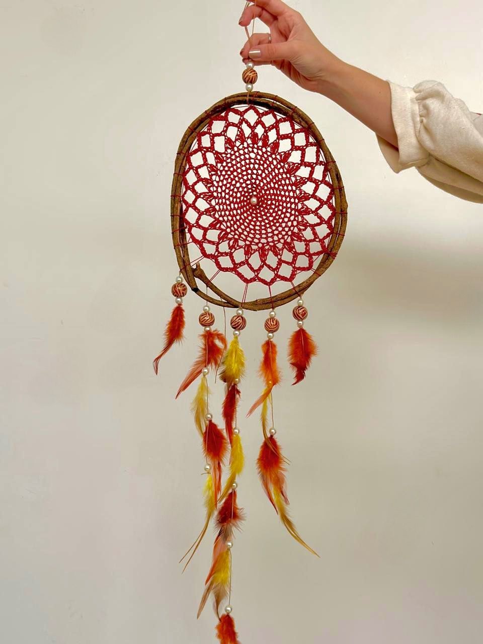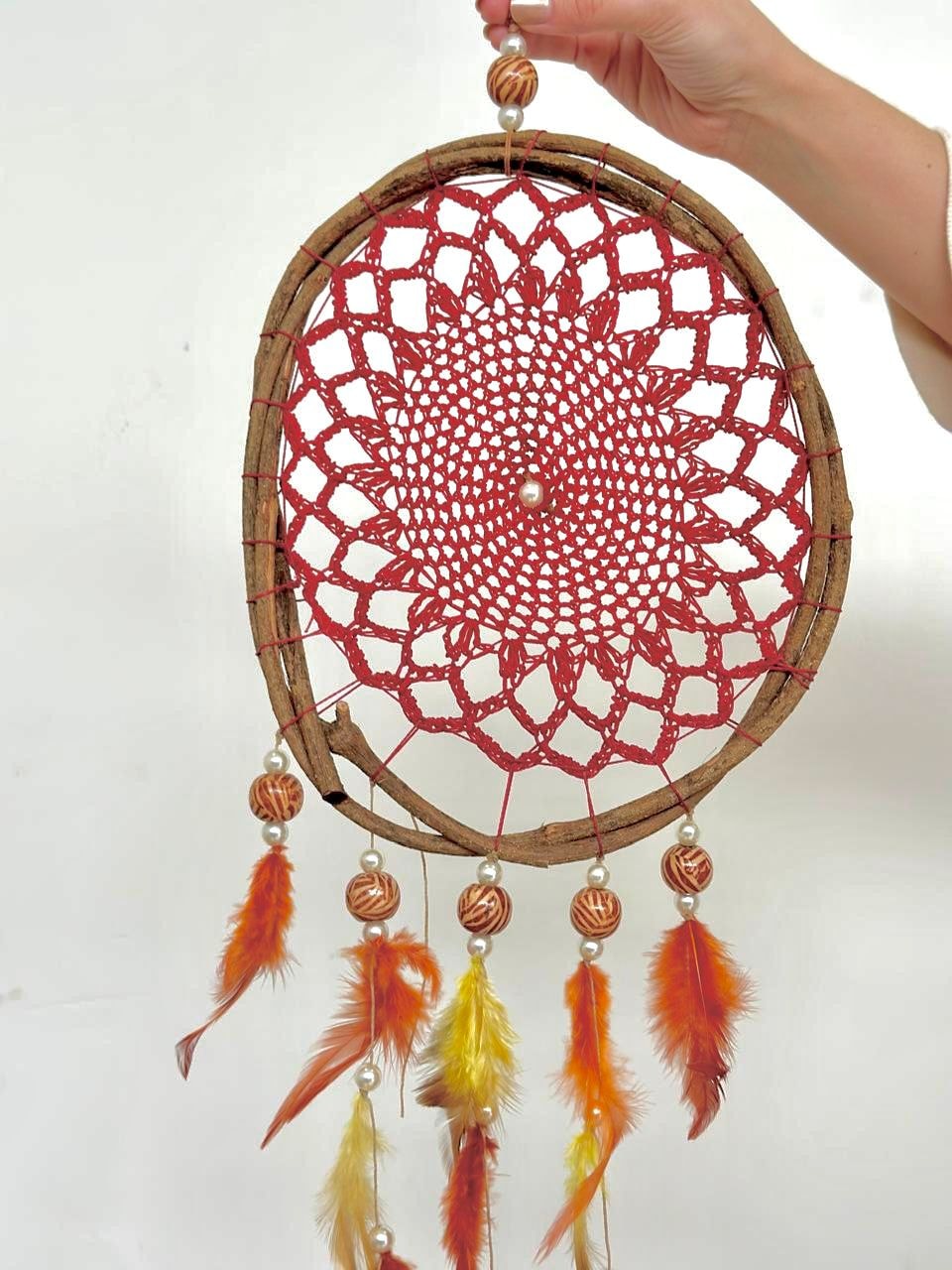 Material: Cipó natural, pérola artificial, cordão encerado, penas de queda natural, com crochê.